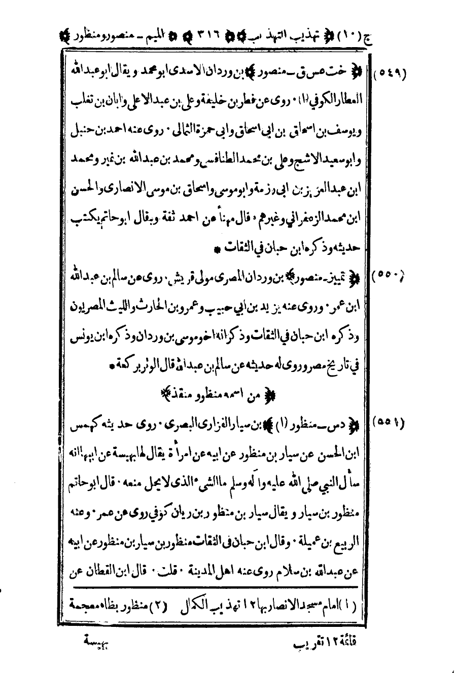 550- "تمييز – منصور" بن وردان المصري مولى قريش روى عن سالم بن عبد الله بن عمر وروى عنه يزيد بن أبي حبيب وعمرو بن الحارث والليث المصريون وذكره ابن حبان في الثقات وذكر أنه أبو أخو موسى بن وردان وذكره بن يونس في تاريخ مصر وروى له حديثه عن سالم بن عبد الله قال الوتر بركعة.