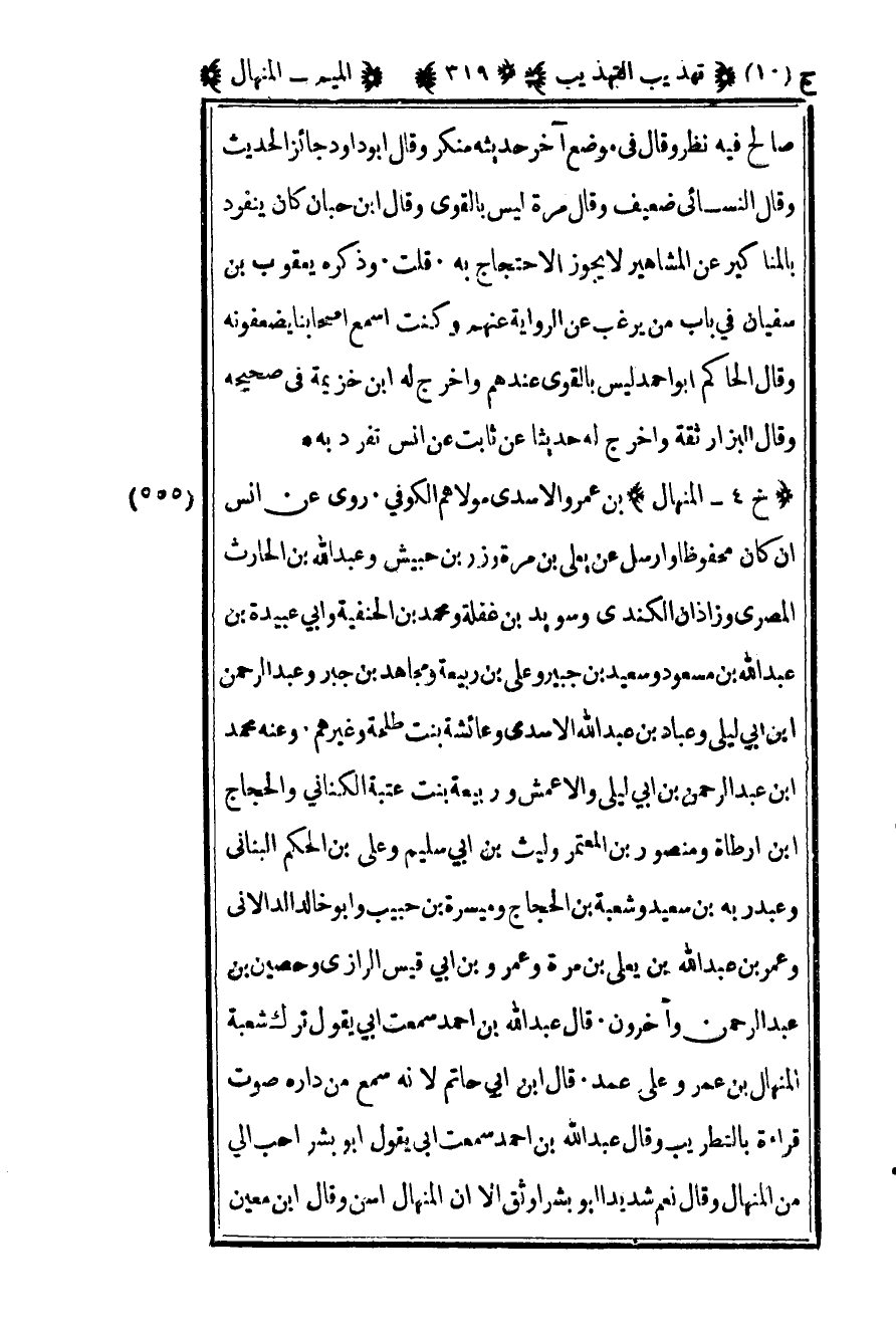 555– "خ 4 – المنهال" بن عمرو الأسدي مولاهم الكوفي روى عن أنس إن كان محفوظا وأرسل عن يعلى بن مرة وزر بن حبيش وعبد الله بن الحارث المصري وزاذان الكندي وسويد بن غفلة ومحمد بن الحنفية وأبي عبيدة بن عبد الله أبن مسعود وسعيد بن جبير وعلي بن ربيعة ومجاهد بن جبر وعبد الرحمن بن أبي ليلى وعباد بن عبد الله الأسدي وعائشة بنت طلحة وغيرهم وعنه محمد بن عبد الرحمن بن أبي ليلى والأعمش وربيعة بنت عتبة الكناني والحجاج بن أرطاة ومنصور بن المعتمر وليث بن أبي سليم وعلي بن الحكم البناني وعبد ربه بن سعيد وشعبة بن الحجاج وميسرة بن حبيب وأبو خالد الدالاني وعمر بن عبد الله بن يعلى بن مرة وعمرو بن أبي قيس الرازي وحصين بن عبد الرحمن وآخرون قال عبد الله بن أحمد سمعت أبي يقول ترك شعبة المنهال بن عمر وعلى عمد قال بن أبي حاتم لأنه سمع من داره صوت قراءة بالتطريب وقال عبد الله بن أحمد سمعت أبي يقول أبو بشر أحب إلي من المنهال وقال نعم شديدا أبو بشر أوثق إلا أن المنهال أسن وقال ابن معين