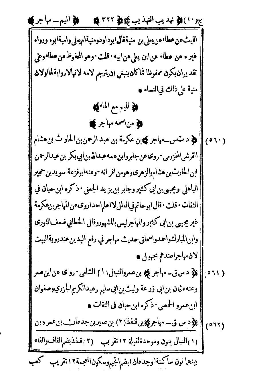 561- "د س ق – مهاجر" بن عمرو النبال1 الشامي روى عن بن عمر وعنه عثمان بن أبي زرعة وليث بن أبي سليم وعبد الكريم الجزري وصفوان بن عمرو الحمصي ذكره ابن حبان في الثقات.