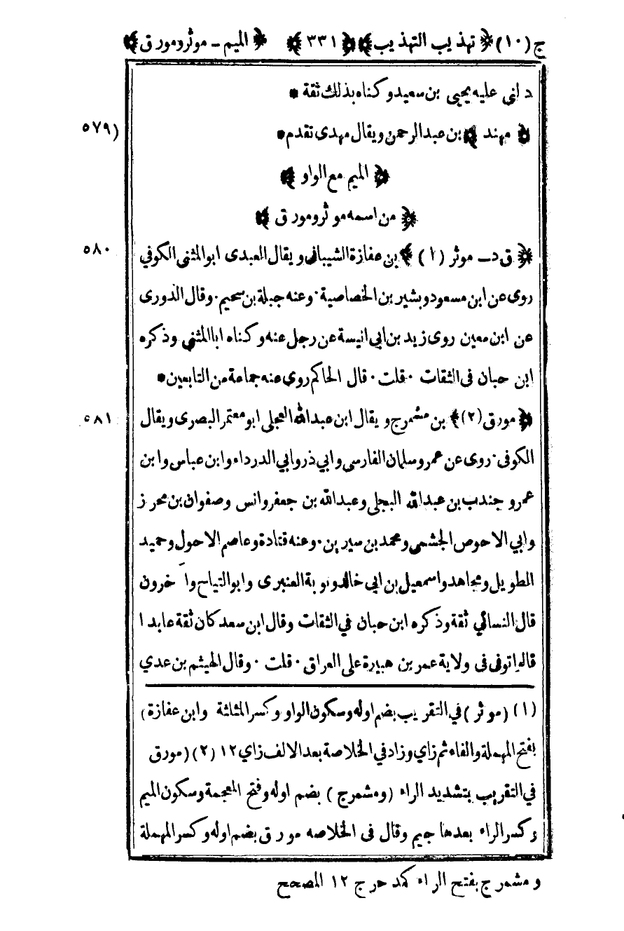 2 "مورق في التقريب بتشديد الراء "ومشمرج" بضم أوله وفتح المعجمة وسكون الميم وكسر الراء بعدها جيم وقال في الخلاصة مورق بضم أوله وكسر المهملة ومشمرج بفتح الراء كمد حرج 12 المصحح.