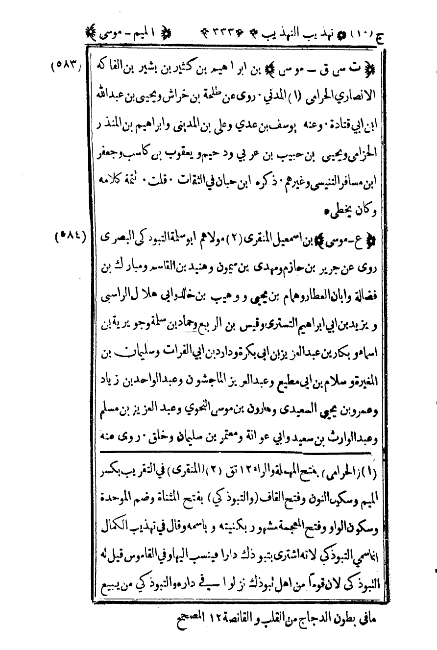583 – "ت سي ق – موسى" بن إبراهيم بن كثير بن بشير بن الفاكه الأنصاري الحرامي1 المدني روى عن طلحة بن خراش ويحيى بن عبد الله بن أبي قتادة وعنه يوسف بن عدي وعلي بن المديني وإبراهيم بن المنذر الحزامي ويحيى بن حبيب بن عربي ودحيم ويعقوب بن كاسب وجعفر بن مسافر التنيسي وغيرهم ذكره ابن حبان في الثقات قلت تتمة كلامه وكان يخطئ.