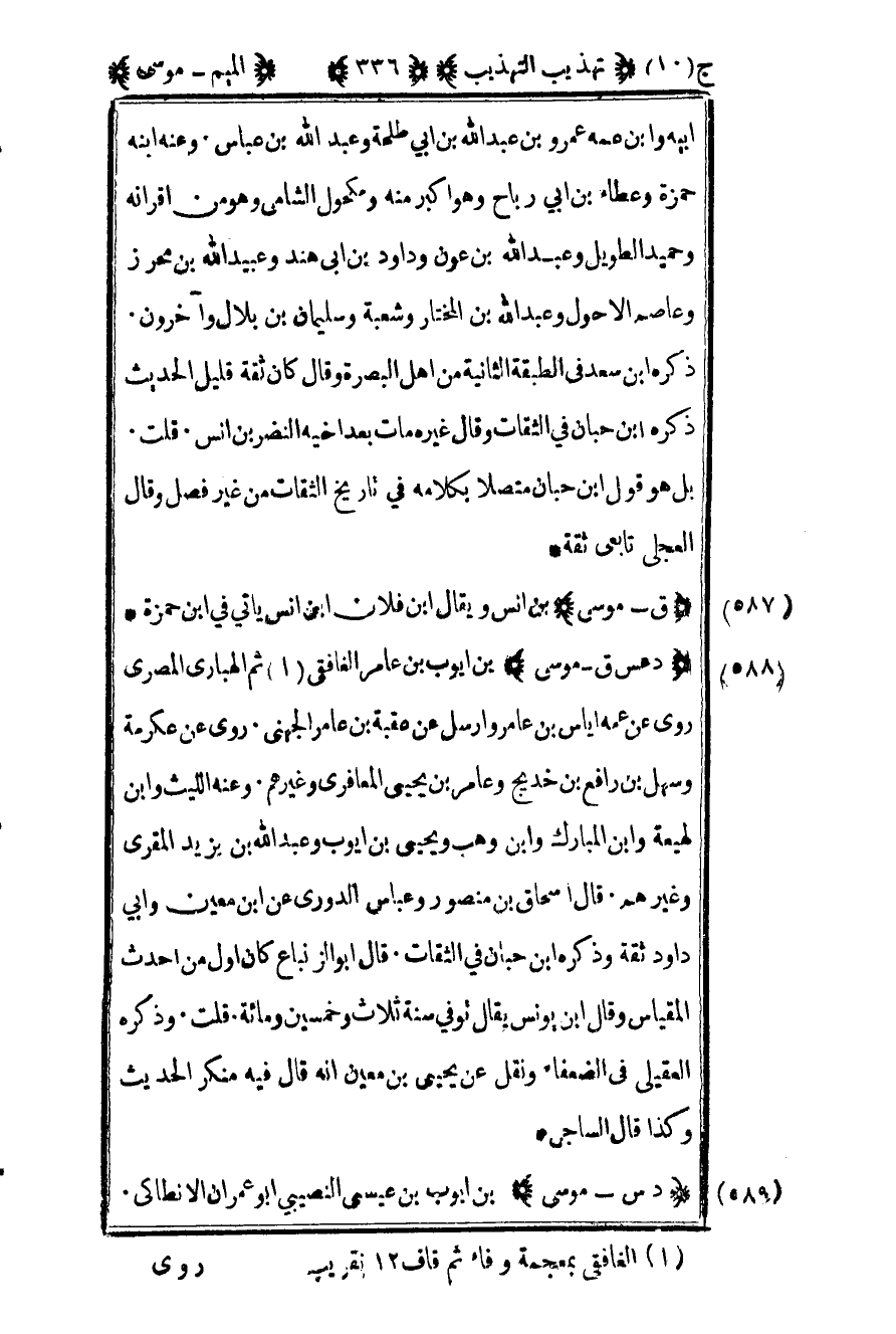 588 – "د عس ق – موسى" بن أيوب بن عامر الغافقي1 ثم الهباري المصري روى عن عمه إياس بن عامر وأرسل عن عقبة بن عامر الجهني روى عن عكرمة وسهل بن رافع بن خديج وعامر بن يحيى المعافري وغيرهم وعنه الليث وابن لهيعة وابن المبارك وابن وهب ويحيى بن أيوب وعبد الله بن أيوب وعبد الله بن يزيد المقري وغيرهم قال إسحاق بن منصور وعباس الدوري عن بن معين وأبي داود ثقة وذكره ابن حبان في الثقات قال أبو الزنباع كان أول من أحدث المقياس وقال بن يونس يقال توفي سنة ثلاث وخمسين ومائة قلت وذكره العقيلي في الضعفاء ويقل عن يحيى بن معين أنه قال فيه منكر الحديث وكذا قال الساجي.