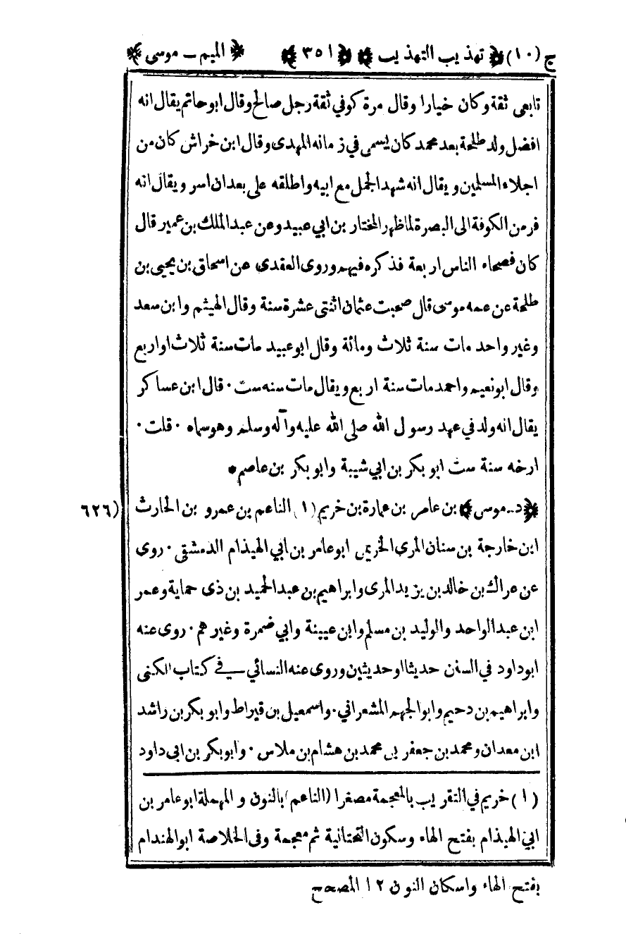 626 – "د – موسى" بن عامر بن عمارة بن خريم1 الناعم بن عمرو بن الحارث بن خارجة بن سنان المري الخريمي أبو عامر بن أبي الهيذام الدمشقي روى عن عراك بن خالد بن يزيد المري وإبراهيم بن عبد الحميد بن ذي حماية وعمر بن عبد الواحد والوليد بن مسلم وابن عيينة وأبي ضمرة وغيرهم روى عنه أبو داود في السنن حديثا أو حديثين وروى عنه النسائي في كتاب الكنى وإبراهيم بن دحيم وأبو الجهم المشعراني وإسماعيل بن قيراط وأبو بكر بن راشد بن معدان ومحمد بن جعفر بن محمد بن هشام بن ملاس وأبو بكر بن أبي داود