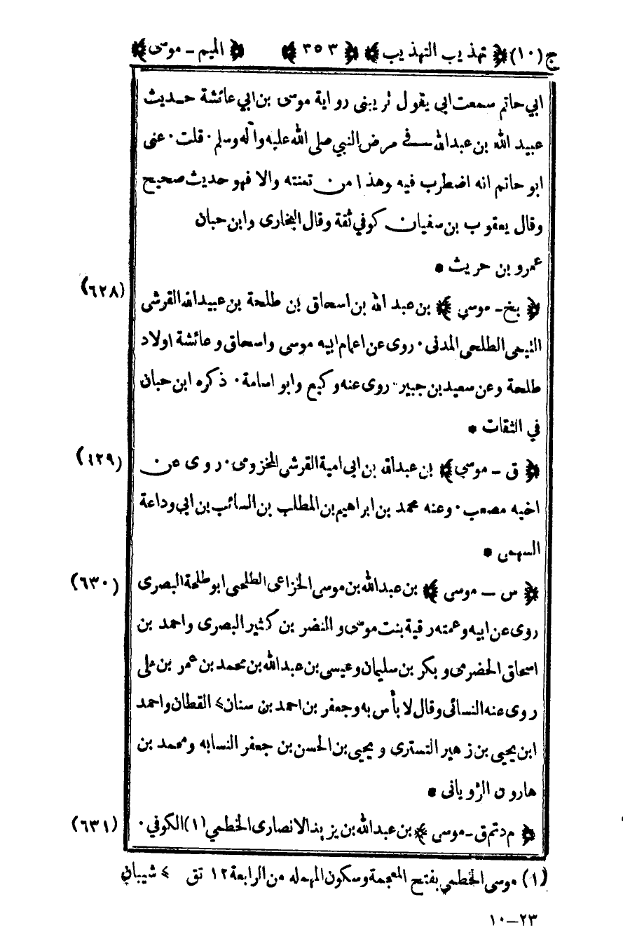 628 – "بخ – موسى" بن عبد الله بن إسحاق بن طلحة بن عبيد الله القرشي التيمي الطلحي المدني روى عن أعمام أبيه موسى وإسحاق وعائشة أولاد طلحة وعن سعيد بن جبير روى عنه وكيع وأبو أسامة ذكره ابن حبان في الثقات.
