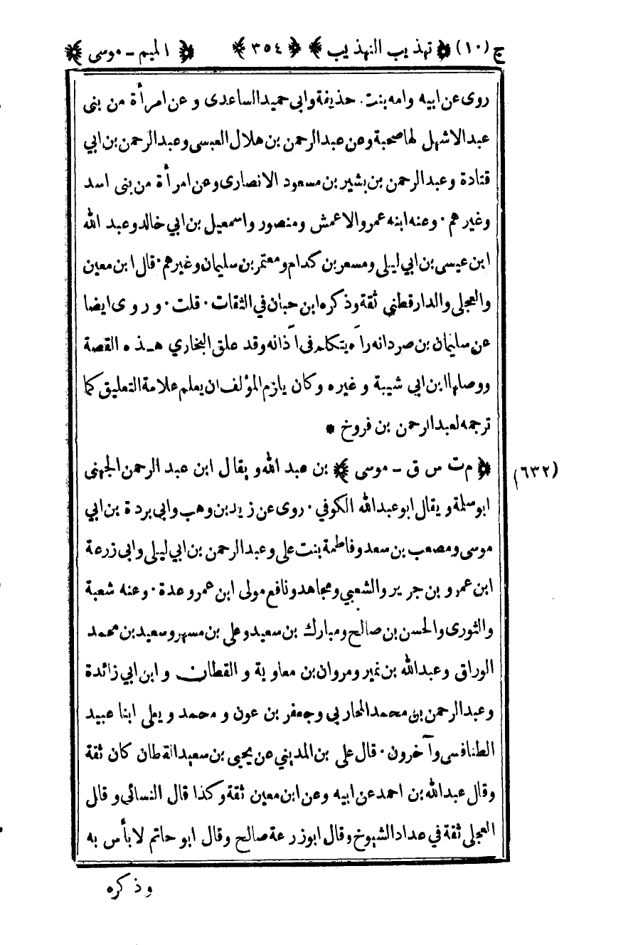 632 – "م ت س ق – موسى" بن عبد الله ويقال بن عبد الرحمن الجهني أبو سلمة ويقال أبو عبد الله الكوفي روى عن زيد بن وهب وأبي بردة بن أبي موسى ومصعب بن سعد وفاطمة بنت علي وعبد الرحمن بن أبي ليلى وأبي زرعة بن عمرو بن جرير والشعبي ومجاهد ونافع مولى بن عمر وعدة وعنه شعبة والثوري والحسن بن صالح ومبارك بن سعيد وعلي بن مسهر وسعيد بن محمد الوراق وعبد الله بن نمير ومروان بن معاوية والقطان وابن أبي زائدة وعبد الرحمن بن محمد المحاربي وجعفر بن عون ومحمد ويعلى ابنا عبيد الطنافسي وآخرون وقال علي بن المديني عن يحيى بن سعيد القطان كان ثقة وقال عبد الله بن أحمد عن أبيه وعن بن معين ثقة وكذا قال النسائي وقال العجلي ثقة في عداد الشيوخ وقال أبو زرعة صالح وقال أبو حاتم لا بأس به