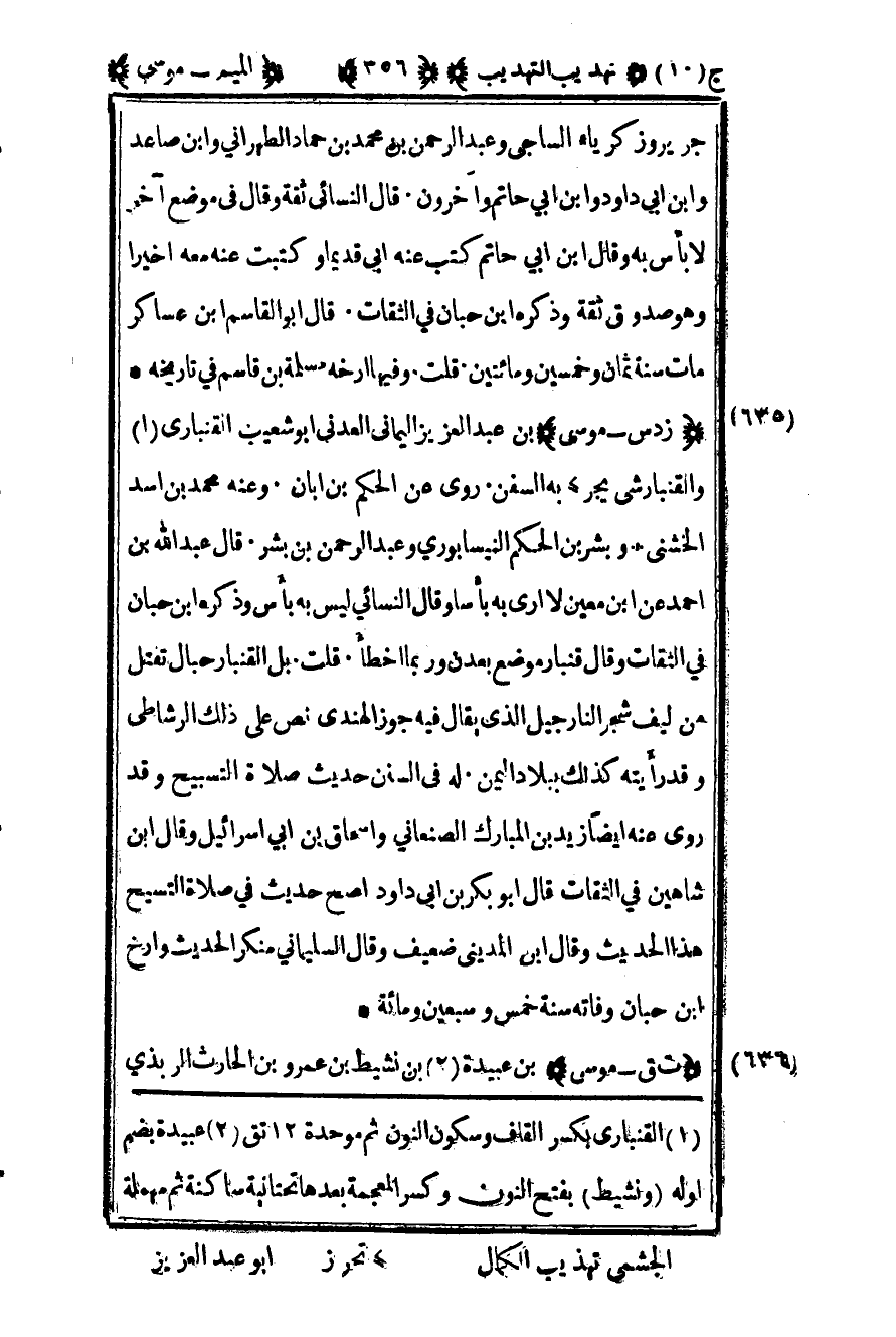 635 – "ز د س – موسى" بن عبد العزيز اليماني العدني أبو شعيب القنباري1 والقنبار شيء يجر2 به السفن روى عن الحكم بن أبان وعنه محمد بن أسد الخشني وبشر بن الحكم النيسابوري وعبد الرحمن بن بشر قال عبد الله بن أحمد عن بن معين لا أرى به بأسا وقال النسائي ليس به بأس وذكره ابن حبان في الثقات وقال قنبار موضع بعدن وربما أخطأ قلت بل القنبار حبال تفتل من ليف شجر النارجيل الذي يقال فيه جوز الهندي نص على ذلك الرشاطي وقد رأيته كذلك ببلاد اليمن له في السنن حديث صلاة التسبيح وقد روى عنه أيضا زيد بن المبارك الصنعاني وإسحاق بن أبي إسرائيل وقال ابن شاهين في الثقات قال أبو بكر بن أبي داود أصح حديث في صلاة التسبيح هذا الحديث وقال ابن المديني ضعيف وقال السليماني منكر الحديث وأرخ ابن حبان وفاته سنة خمس وسبعين ومائة.