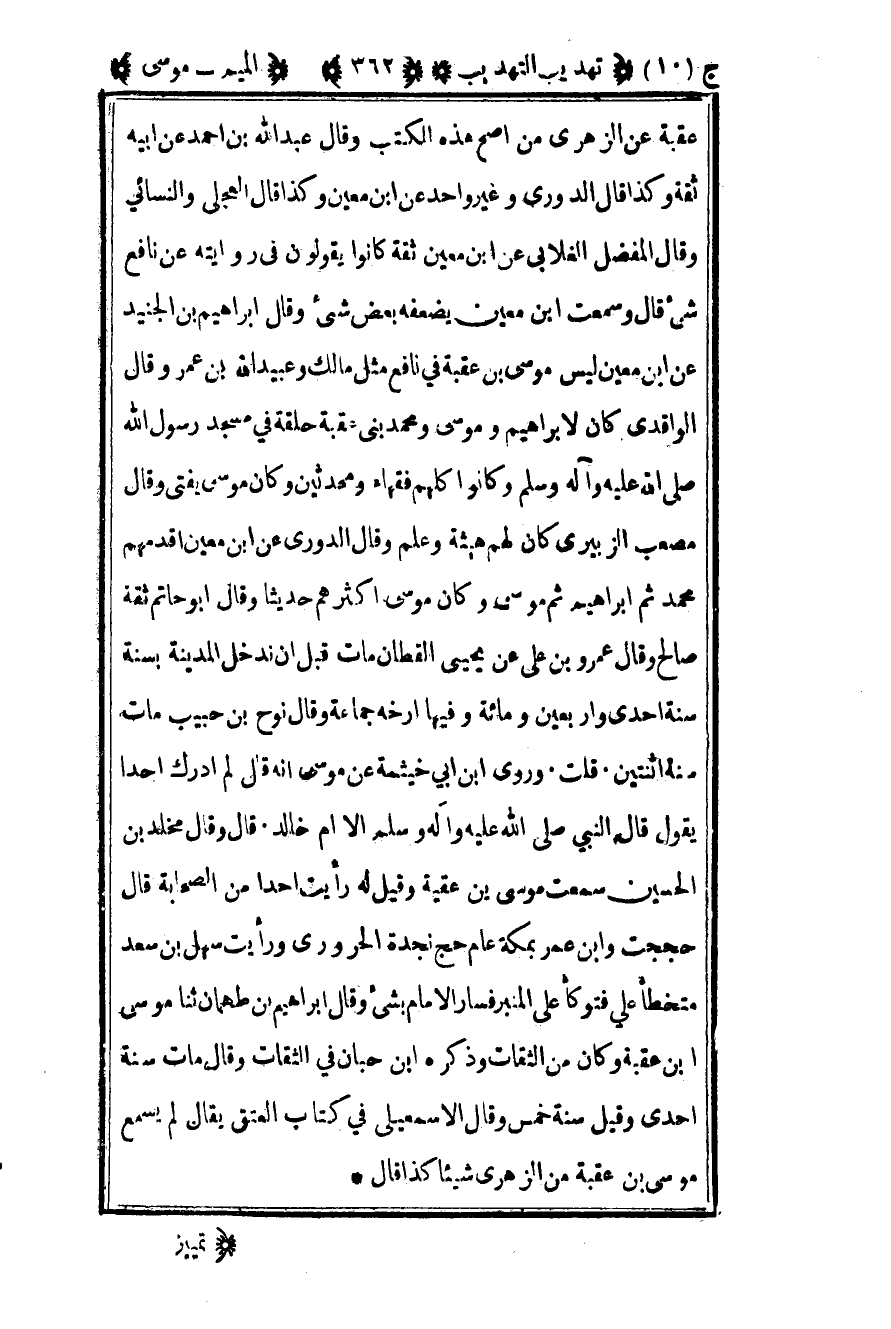 عقبة عن الزهري من أصح هذه الكتب وقال عبد الله بن أحمد عن أبيه ثقة وكذا قال الدوري وغير واحد عن بن معين وكذا قال العجلي والنسائي وقال المفضل الغلابي عن بن معين ثقة كانوا يقولون في روايته عن نافع شيء قال وسمعت ابن معين يضعفه بعض شيء وقال إبراهيم بن الجنيد عن ابن معين ليس موسى بن عقبة في نافع مثل مالك وعبيد الله بن عمر وقال الواقدي كان لإبراهيم وموسى ومحمد بني عقبة حلقة في مسجد رسول الله صلى الله عليه وسلم وكانوا كلهم فقهاء ومحدثين وكان موسى يفتي وقال مصعب الزبيري كان لهم هيئة وعلم وقال الدوري عن ابن معين أقدمهم محمد ثم إبراهيم ثم موسى وكان موسى أكثرهم حديثا وقال أبو حاتم ثقة صالح وقال عمرو بن علي عن يحيى القطان مات قبل أن ندخل المدينة بسنة سنة إحدى وأربعين ومائة وفيها أرخه جماعة وقال نوح بن حبيب مات سنة اثنتين قلت وروى ابن أبي خيثمة عن موسى أنه قال لم أدرك أحدا يقول قال النبي صلى الله عليه وسلم إلا أم خالد قال وقال مخلد بن الحسين سمعت موسى بن عقبة وقيل له رأيت أحدا من الصحابة قال حججت وابن عمر بمكة عام حج نجدة الحروري ورأيت سهل بن سعد متخطأ علي فتوكأ على المنبر فسار الإمام بشيء وقال إبراهيم بن طهمان ثنا موسى بن عقبة وكان من الثقات وذكره ابن حبان في الثقات وقال مات سنة إحدى وقيل سنة خمس وقال الإسماعيلي في كتاب العتق يقال لم يسمع موسى بن عقبة من الزهري شيئا كذا قال.