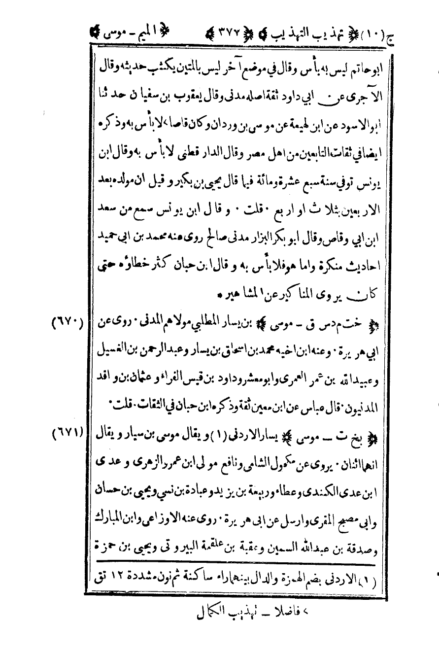 670 – "خت م د س ق –موسى" بن يسار المطلبي مولاهم المدني روى عن أبي هريرة وعنه بن أخيه محمد بن إسحاق بن يسار وعبد الرحمن بن الغسيل وعبيد الله بن عمر العمري وأبو معشر وداود بن قيس الفراء وعثمان بن واقد المدنيون قال عباس عن بن معين ثقة وذكره ابن حبان في الثقات قلت.