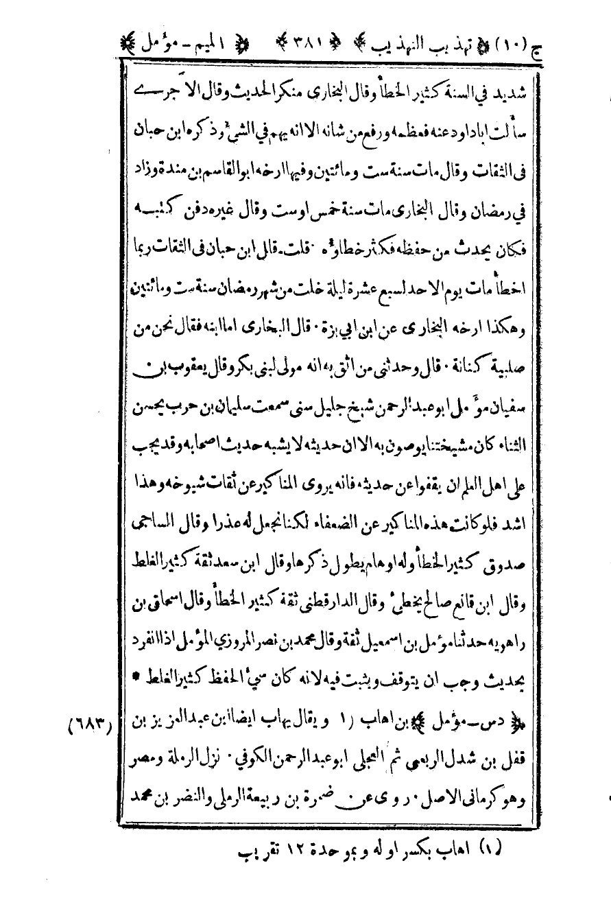 683 – "د س – مؤمل" بن إهاب1 ويقال يهاب أيضا بن عبد العزيز بن قفل بن شدل الربعي ثم العجلي أبو عبد الرحمن الكوفي نزل الرملة ومصر وهو كرماني الأصل روى عن ضمرة بن ربيعة الرملي والنضر بن محمد