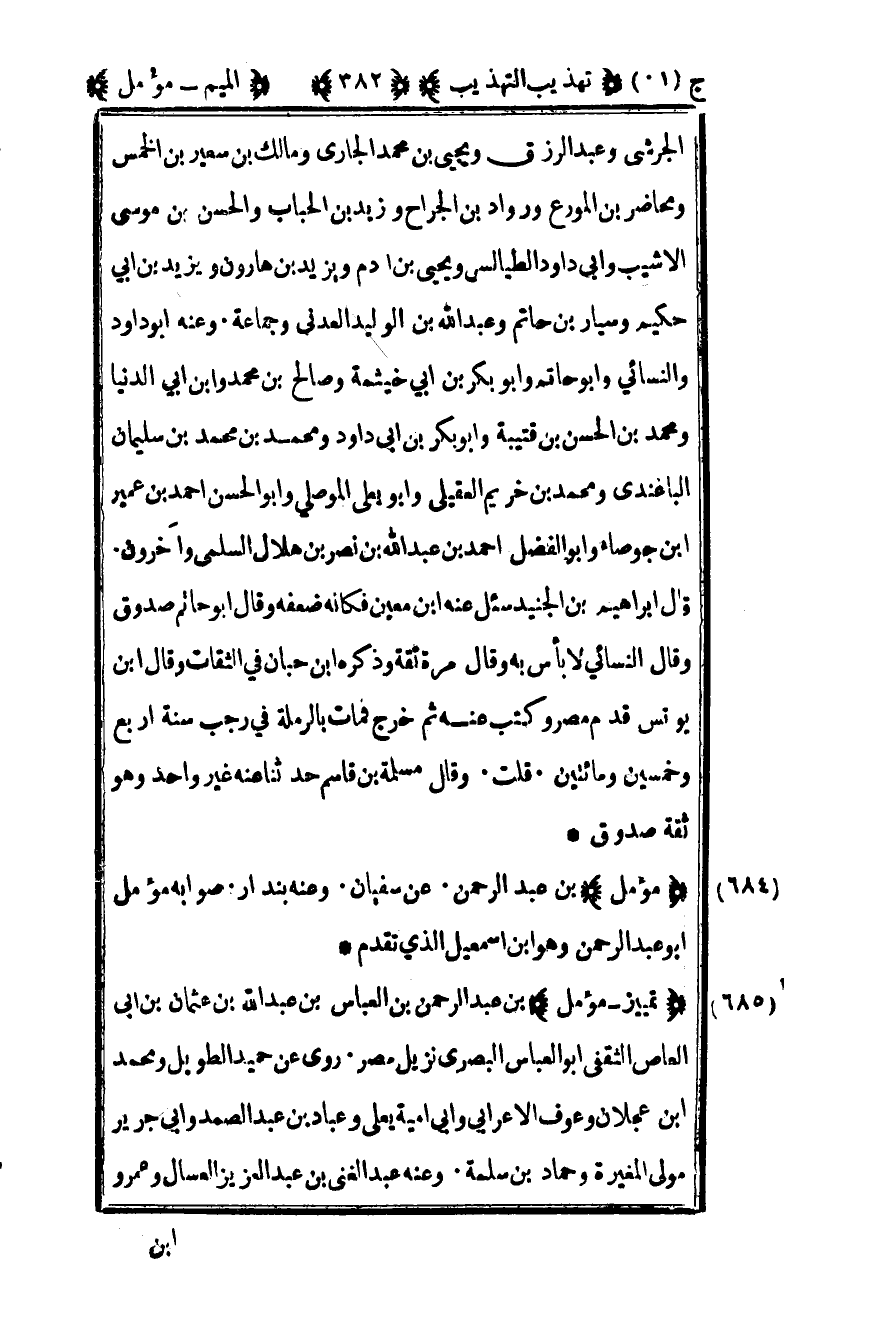 684 – "مؤمل" بن عبد الرحمن عن سفيان وعنه بندار صوابه مؤمل أبو عبد الرحمن وهو بن إسماعيل الذي تقدم.