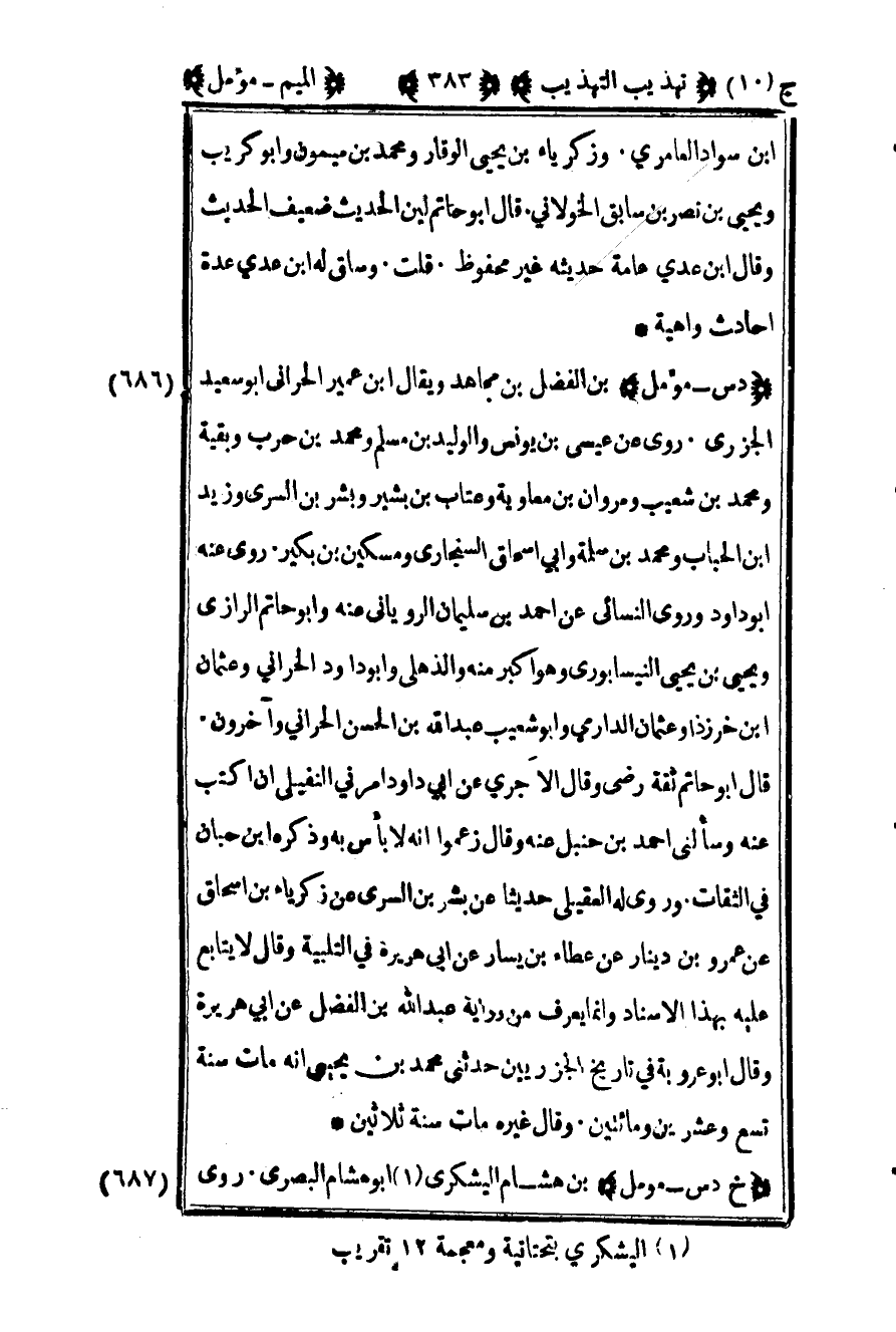 686 – "د س – مؤمل" بن الفضل بن مجاهد ويقال بن عمير الحراني أبو سعيد الجزري روى عن عيسى بن يونس والوليد بن مسلم ومحمد بن حرب وبقية ومحمد بن شعيب ومروان بن معاوية وعتاب بن بشير وبشر بن السري وزيد بن الحباب ومحمد بن سلمة وأبي إسحاق السنجاري ومسكين بن بكير روى عنه أبو داود وروى النسائي عن أحمد بن سليمان الروياني عنه وأبو حاتم الرازي ويحيى بن يحيى النيسابوري وهو أكبر منه والذهلي وأبو داود الحراني وعثمان بن خرزاذ وعثمان الدارمي وأبو شعيب عبد الله بن الحسن الحراني وآخرون قال أبو حاتم ثقة رضي وقال الآجري عن أبي داود أمرني النفيلي أن اكتب عنه وسألني أحمد بن حنبل عنه وقال زعموا أنه لا بأس به وذكره ابن حبان في الثقات وروى له العقيلي حديثا عن بشر بن السري عن زكريا بن إسحاق عن عمرو بن دينار عن عطاء بن يسار عن أبي هريرة في التلبية وقال لا يتابع عليه بهذا الإسناد وإنما يعرف من رواية عبد الله بن الفضل عن أبي هريرة وقال أبو عروبة في تاريخ الجزريين حدثني محمد بن يحيى أنه مات سنة تسع وعشرين ومائتين وقال غيره مات سنة ثلاثين.