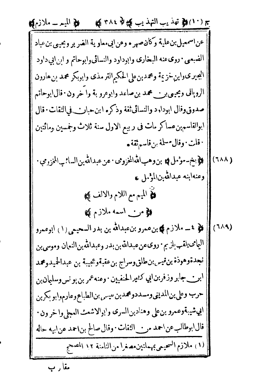 689- "4- ملازم" بن عمرو بن عبد الله بن بدر السحيمي1 أبو عمرو اليمامي يلقب بلزيم روى عن عبد الله بن بدر وعبد الله بن النعمان وموسى بن نجدة وهوذة بن قيس بن طلق وسراج بن عقبة وعجيبة بن عبد الحميد ومحمد بن جابر وزفر بن أبي كثير الحنفيين وعنه عمر بن يونس وسليمان بن حرب وعلي بن المديني ومسدد ومحمد بن عيسى بن الطباع وعارم وأبو بكر بن أبي شيبة وعمرو بن علي وهناد بن السري وأبو الأشعث العجلي وآخرون قال أبو طالب عن أحمد من الثقات وقال صالح بن أحمد عن أبيه حاله