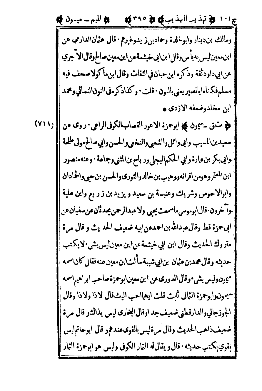 711 – "ت ق – ميمون" أبو حمزة الأعور القصاب الكوفي الراعي روى عن سعيد بن المسيب وأبي وائل والشعبي والنخعي والحسن وأبي صالح مولى طلحة وأبي بكر بن عمارة وأبي الحكم البجلي ورباح بن المثنى وجماعة وعنه منصور بن المعتمر وهو من أقرانه ووهيب بن خالد الثوري والحسن بن حيي والحمادان وأبو الأحوص وشريك وعنبسة بن سعيد ويزيد بن زريع وابن عليه وآخرون قال أبو موسى ما سمعت يحيى ولا عبد الرحمن يحدثان عن سفيان عن أبي حمزة قط وقال عبد الله بن أحمد عن أبيه ضعيف الحديث وقال مرة متروك الحديث وقال بن أبي خيثمة عن ابن معين ليس بشيء لا يكتب حديثه وقال محمد بن عثمان بن أبي شيبة سألت ابن معين عنه فقال كان اسمه ميمون وليس بشيء وقال الدوري عن بن معين أبو حمزة صاحب إبراهيم اسمه ميمون وأبو حمزة الثمالي ثابت قلت أيهما أحب إليك قال لا ذا ولا ذا وقال الجوزجاني والدارقطني ضعيف جدا وقال البخاري ليس بذاك وقال مرة ضعيف ذاهب الحديث وقال مرة فليس بالقوي عندهم وقال أبو حاتم ليس بقوي يكتب حديثه قال ويقال له التمار الكوفي وليس هو أبو حمزة التمار