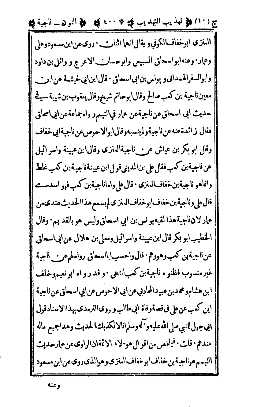 العنزي أبو خفاف الكوفي ويقال إنهما اثنان روى عن بن مسعود وعلي وعمار وعنه أبو إسحاق السبيعي وأبو حسان الأعرج ووائل بن داود وأبو السفر الهمداني ويونس بن أبي إسحاق قال ابن أبي خيثمة عن بن معين ناجية بن كعب صالح وقال أبو حاتم شيخ وقال يعقوب بن شيبة في حديث أبي إسحاق عن ناجية عن عمار في التيمم رواه جماعة عن أبي إسحاق فقال زائدة عنه عن ناجية ولم ينسبه وقال أبو الأحوص عن ناجية أبي خفاف وقال أبو بكر بن عياش عن ناجية العنزي وقال ابن عيينة وإسرائيل عن ناجية بن كعب فقال علي بن المديني قول بن عيينة ناجية بن كعب غلط وإنما هو ناجية بن خفاف العنزي قال علي وأما ناجية بن كعب فهو أسدي قال علي وناجية بن خفاف أبو خفاف العنزي لم يسمع هذا الحديث عندي من عمار لأن ناجية هذا لقيه يونس بن أبي إسحاق وليس هو بالقديم وقال الخطيب أبو بكر قال بن عيينة وإسرائيل ومعلى بن هلال عن أبي إسحاق عن ناجية بن كعب وهو وهم قال وأحسب أبا إسحاق رواه لهم عن ناجية غير منسوب فظنوه ناجية بن كعب انتهى وقد رواه أبو نعيم وخلف بن هشام ومحمد بن عبيد المحاربي عن أبي الأحوص عن أبي إسحاق عن ناجية بن كعب عن علي في قصة وفاة أبي طالب وروى الترمذي بهذا الإسناد قول أبي جهل للنبي صلى الله عليه وسلم انا لا نكذبك الحديث وهذا جميع ماله عندهم قلت فيلخص من أقوال هؤلاء الأئمة أن الراوي عمار حديث التيمم هو ناجية بن خفاف أبو خفاف العنزي وهو الذي روى عن بن مسعود