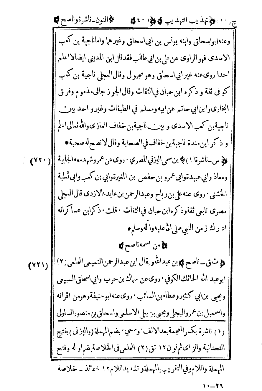 720 – "س – ناشرة1" بن سمي اليزني المصري روى عن عمر وشهد معه الجابية ومعاذ وأبي عبيدة وأبي عمرو بن حفص بن المغيرة وأبي بن كعب وأبي ثعلبة الخشني روى عنه علي بن رباح وعبد الرحمن بن عابد2 الأزدي قال العجلي مصري تابعي ثقة وذكره ابن حبان في الثقات قلت ذكر بن عساكر أنه أدرك زمن النبي صلى الله عليه وسلم.