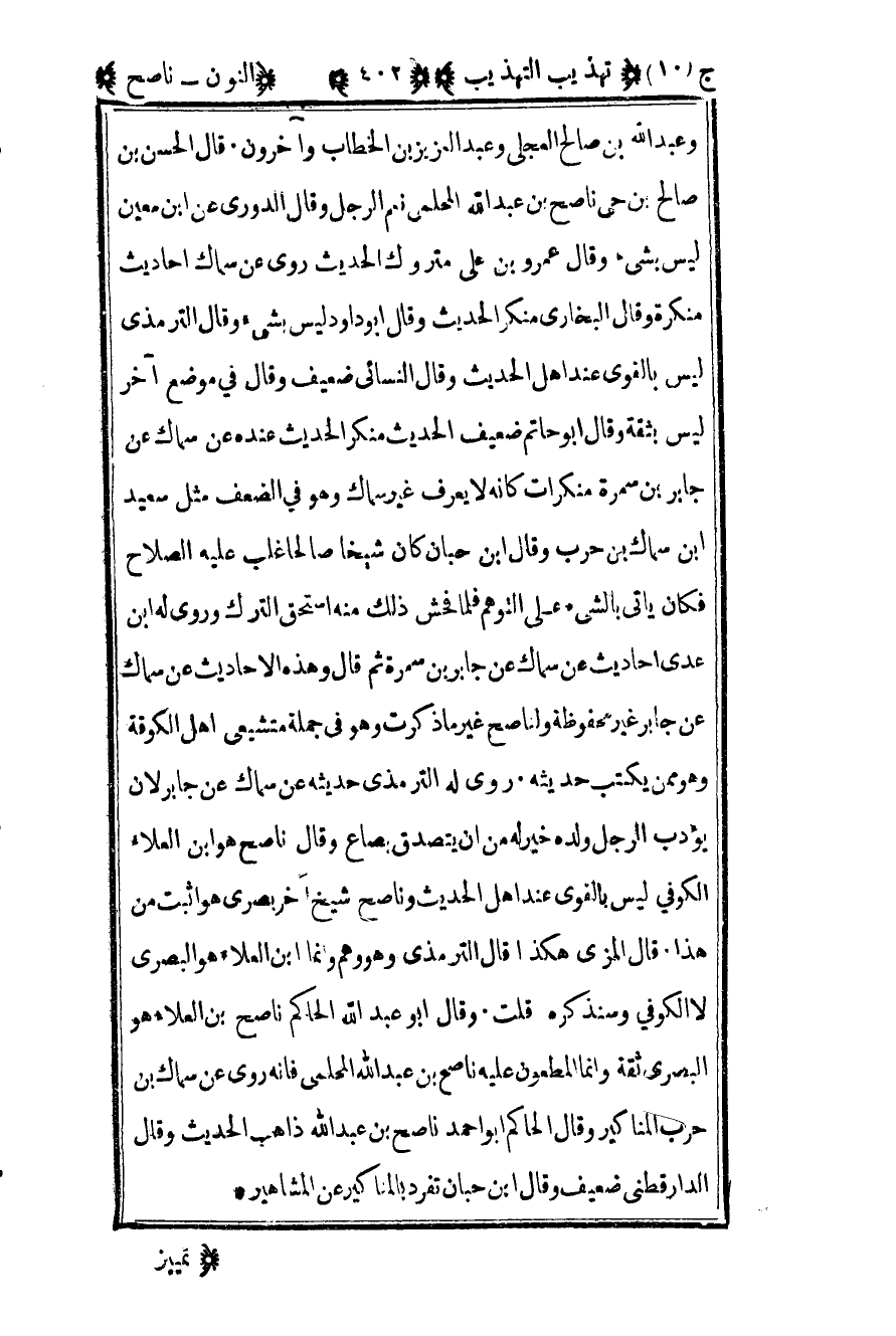 وعبد الله بن صالح العجلي وعبد العزيز بن الخطاب وآخرون قال الحسن بن صالح بن حي ناصح بن عبد الله المحلمي نعم الرجل وقال الدوري عن ابن معين ليس بشيء وقال عمرو بن علي متروك الحديث روى عن سماك أحاديث منكرة وقال البخاري منكر الحديث وقال أبو داود ليس بشيء وقال الترمذي ليس بالقوي عند أهل الحديث وقال النسائي ضعيف وقال في موضع آخر ليس بثقة وقال أبو حاتم ضعيف الحديث منكر الحديث عنده عن سماك عن جابر بن سمرة منكرات كأنه لا يعرف غير سماك وهو في الضعف مثل سعيد بن سماك بن حرب وقال ابن حبان كان شيخا صالحا غلب عليه الصلاح فكان يأتي بالشيء على التوهم فلما فحش ذلك منه استحق الترك وروى له بن عدي أحاديث عن سماك عن جابر بن سمرة ثم قال وهذه الأحاديث عن سماك عن جابر غير محفوظة ولنا صح غير ما ذكرت وهو في جملة متشيعي أهل الكوفة وهو ممن يكتب حديثه روى له الترمذي حديثه عن سماك عن جابر لأن يؤدب الرجل ولده خير له من أن يتصدق بصاع وقال ناصح هو بن العلاء الكوفي ليس بالقوي عن أهل الحديث وناصح شيخ آخر بصري هو أثبت من هذا قال المزي هكذا قال الترمذي وهو وهم وإنما بن العلاء هو البصري لا الكوفي وسنذكره قلت وقال أبو عبد الله الحاكم ناصح بن العلاء هو البصري ثقة وإنما المطعون عليه ناصح بن عبد الله المحلمي فإنه روى عن سماك بن حرب المناكير وقال الحاكم أبو أحمد ناصح بن عبد الله ذاهب الحديث وقال الدارقطني ضعيف وقال ابن حبان تفرد بالمناكير عن المشاهير.