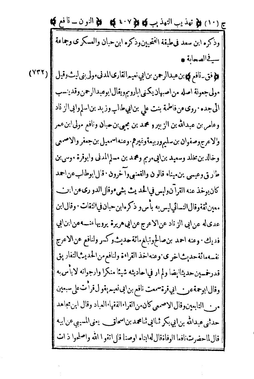 732- "فق – نافع" بن عبد الرحمن بن أبي نعيم القارئ المدني مولى بني ليث وقيل مولى جعونة أصله من أصبهان يكنى أبا رويم ويقال أبو عبد الرحمن وقد ينسب إلى جده روى عن فاطمة بنت علي بن أبي طالب وزيد بن أسلم وأبي الزناد وعامر بن عبد الله بن الزبير ومحمد بن بحيي بن حبان ونافع مولى بن عمر والأعرج وصفوان بن سليم وربيعة وغيرهم وعنه إسماعيل بن جعفر والأصمعي وخالد بن مخلد وسعيد بن أبي مريم ومحمد بن مسلم المدني وأبو قرة موسى بن طارق وعيسى بن ميناء قالون والقعنبي وآخرون قال أبو طالب عن أحمد كان يؤخذ عنه القرآن وليس في الحديث بشيء وقال الدوري عن ابن معين ثقة وقال النسائي ليس به بأس وذكره ابن حبان في الثقات وقال ابن عدي له عن أبي الزناد عن الأعرج عن أبي هريرة يرويها عنه عن ابن أبي فديك وعنه أحمد بن صالح وتبلغ مائة حديث وكسر ولنافع عن الأعرج نفسه مائة حديث أخرى وعنه أخذ القراءة ولنافع من الحديث التفاريق قدر خمسين حديثا أيضا ولم أر في أحاديثه شيئا منكرا وأرجو أنه لا بأس به وقال أبو حمة عن أبي قره سمعت نافع بن أبي نعيم يقول قرأت على سبعين من التابعين وقال الأصمعي كان من القراء الفقهاء العباد وقال ابن مجاهد حدثني عبد الله بن أبي بكر ثنا أبي ثنا محمد بن إسحاق يعني المسيبي عن أبيه قال لما حضرت نافعا الوفاة قال له أبناه اوصنا قال اتقوا الله وأصلحوا ذات