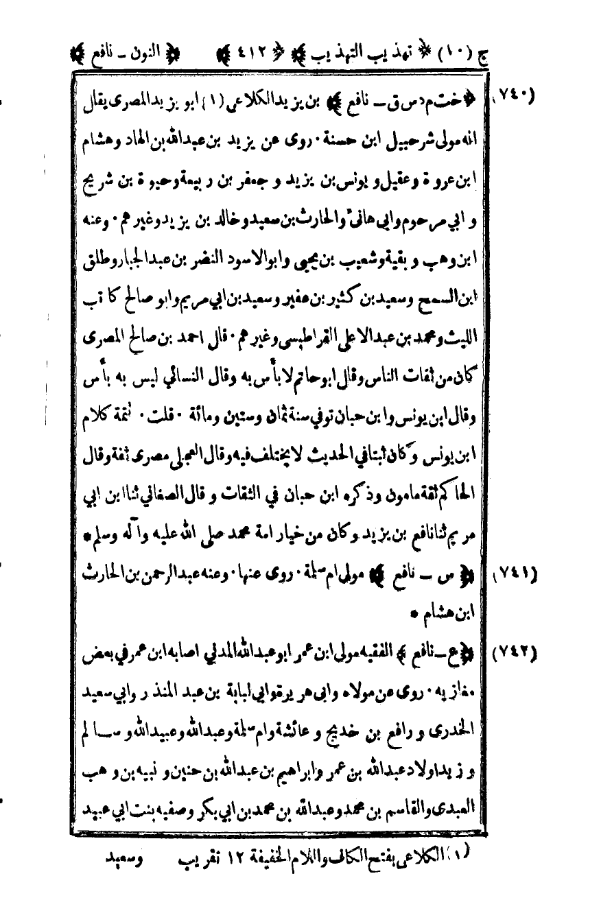742- "ع – نافع" الفقيه مولى ابن عمر أبو عبد الله المدني أصابه ابن عمر في بعض مغازيه روى عن مولاه وأبي هريرة وأبي لبابة بن عبد المنذر وأبي سعيد الخدري ورافع بن خديج وعائشة وأم سلمة وعبد الله وعبيد الله وسالم وزيد أولاد عبد الله بن عمر وإبراهيم بن عبد الله بن حنين ونبيه بن وهب العبدي والقاسم بن محمد وعبد الله بن محمد بن أبي بكر وصفية بنت أبي عبيد