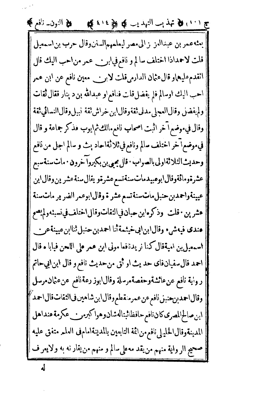 بعثه عمر بن عبد العزيز إلى مصر ليعلمهم السنن وقال حرب بن إسماعيل قلت لأحمد إذا اختلف سالم ونافع في ابن عمر من أحب إليك قال أتقدم عليهما وقال عثمان الدارمي قلت لابن معين نافع عن ابن عمر أحب إليك أو سالم فلم يفضل قلت فنافع أو عبد الله بن دينار فقال ثقات ولم يفضل وقال العجلي مدني ثقة وقال ابن خراش ثقة نبيل وقال النسائي ثقة وقال في موضع آخر أثبت أصحاب نافع مالك ثم أيوب فذكر جماعة وقال في موضع آخر اختلف سالم ونافع في ثلاثة أحاديث وسالم أجل على نافع وحديث الثلاثة أولى بالصواب قال يحيى بن بكير وآخرون مات سنة سبع عشرة ومائة وقال أبو عبيد مات سنة تسع عشرة ويقال سنة عشرين وقال ابن عيينة وأحمد بن حنبل مات سنة تسع عشرة وقال أبو عمر الضرير مات سنة عشرين قلت وذكره ابن حبان في الثقات وقال اختلف في نسبته ولم يصح عندي فيه شيء وقال ابن أبي خيثمة ثنا أحمد بن حنبل ثنا بن عيينة عن إسماعيل بن أمية قال كنا نريد نافعا مولى ابن عمر على اللحن فيأباه قال أحمد قال سفيان فأي حديث أوثق من حديث نافع وقال ابن أبي حاتم رواية نافع عن عائشة وحفصة مرسلة وقال أبو زرعة نافع عن عثمان مرسل وقال أحمد بن حنبل نافع عن عمر منقطع وقال ابن شاهين في الثقات قال أحمد بن صالح المصري كان نافع حافظا ثبتا له شأن وهو أكبر من عكرمة عند أهل المدينة وقال الخليلي نافع من أئمة التابعين بالمدينة إمام في العلم متفق عليه صحيح الرواية منهم من يقدمه على سالم ومنهم من يقارنه به ولا يعرف