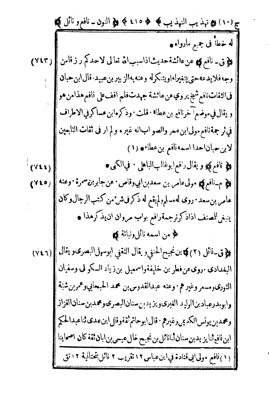 745- "م – نافع" مولى عامر بن سعد بن أبي وقاص عن جابر بن سمرة وعنه عامر بن سعد روى له مسلم ولم يقع له ذكر في شيء من كتب الرجال وكان ينبغي للمصنف إذا ذكر ترجمة رافع بواب مروان أن يذكر هذا.