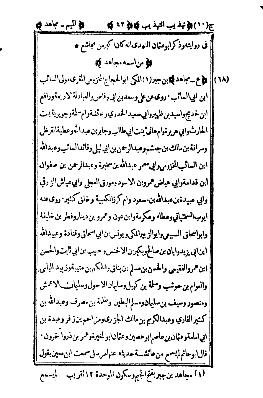 68 -"ع – مجاهد" بن جبر1 المكي أبو الحجاج المخزومي المقري مولى السائب بن أبي السائب. روى عن علي وسعد بن أبي وقاص والعبادلة الأربعة ورافع بن خديج وأسيد بن ظهير وأبي سعيد الخدري وعائشة وأم سلمة وجويرية بنت الحارث وأبي هريرة وأم هاني بنت أبي طالب وجابر بن عبد الله وعطيه القرظي وسراقة بن مالك بن جعشم وعبد الرحمن بن أبي ليلى وقائد السائب وعبد الله بن السائب المخزومي وأبي معمر عبد الله بن سخبرة وعبد الرحمن بن صفوان بن قدامة وأبي عياض عمرو بن الأسود ومورق العجلي وأبي عياض الزرقي وأبي عبيدة بن عبد الله بن مسعود وأم كرز الكعبية وخلق كثير روى عنه أيوب السختياني وعطاء وعكرمة وابن عون وعمرو بن دينار وفطر بن خليفة وأبو إسحاق السبيعي وأبو الزبير المكي ويونس بن أبي إسحاق وقتادة وعبيد الله بن أبي يزيد وأبان بن صالح وبكير بن الأخنس وحبيب بن أبي ثابت والحسن بن عمرو الفقيمي والحسن بن مسلم بن يناق والحكم بن عتيبة وزبيد اليامي والعوام بن حوشب وسلمة بن كهيل وسليمان الأحول وسليمان الأعمش ومنصور وسيف بن سليمان ومسلم البطين وطلحة بن مصرف وعبد الله بن كثير القاري وعبد الكريم بن مالك الجزري ومزاحم بن زفر وعبدة بن أبي أمامة وعثمان بن عاصم أبو حصين وعثمان أبو المغيرة وعمر بن ذر وآخرون قال أبو حاتم لم يسمع من عائشة حديثه عنها مرسل سمعت ابن معين يقول