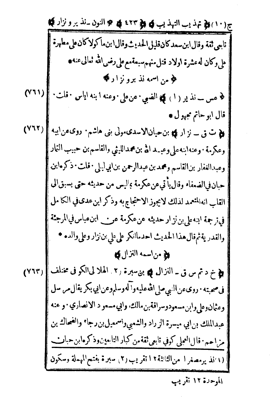 763- "خ د تم س ق – النزال" بن سبرة2 الهلالي الكوفي مختلف في صحبته روى عن النبي صلى الله عليه وسلم وعن أبي بكر يقال مرسل وعثمان وعلي وابن مسعود وسراقة بن مالك وأبي مسعود الأنصاري وعنه عبد الملك بن أبي ميسرة الزراد والشعبي وإسماعيل بن رجاء والضحاك بن مزاحم قال العجلي كوفي تابعي ثقة من كبار التابعين وذكره ابن حبان