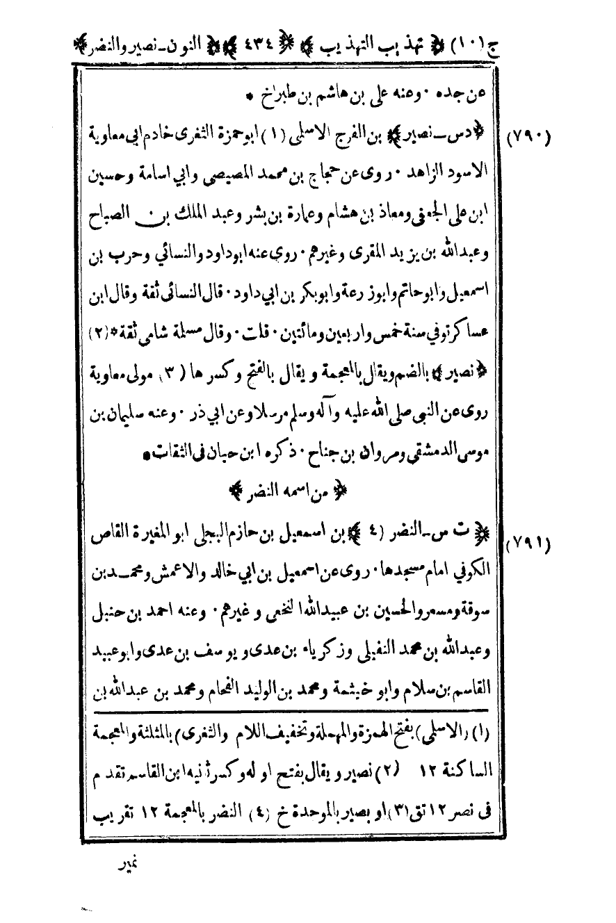 791- "ت س – النضر4" بن إسماعيل بن حازم البجلي أبو المغيرة القاص الكوفي إمام مسجدها روى عن إسماعيل بن أبي خالد والأعمش ومحمد بن سوقة ومسعر والحسين بن عبيد الله النخعي وغيرهم وعنه أحمد بن حنبل وعبد الله بن محمد النفيلي وزكرياء بن عدي ويوسف بن عدي وأبو عبيد القاسم بن سلام وأبو خيثمة ومحمد بن الوليد الفحام ومحمد بن عبد الله بن