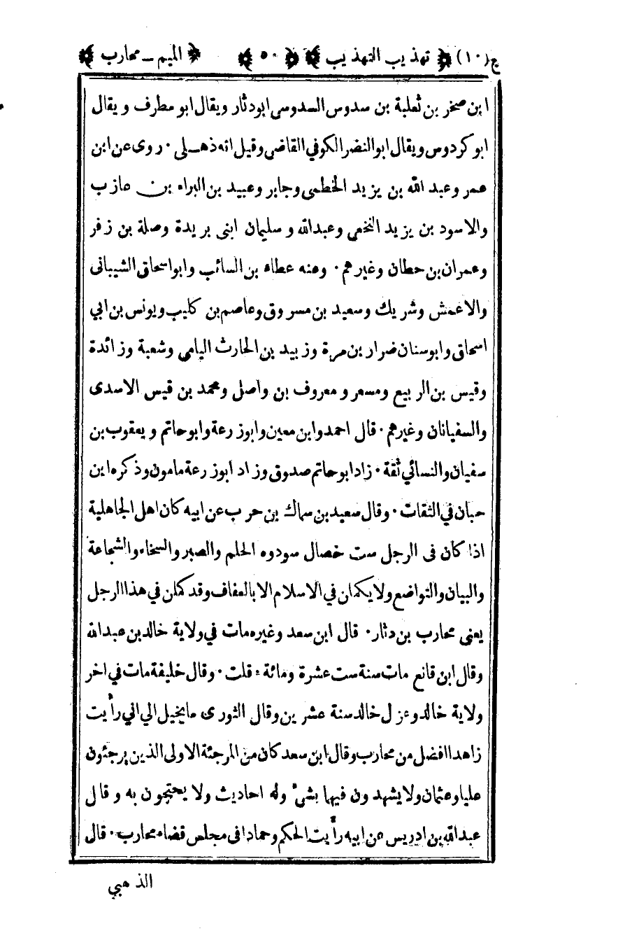 ابن صخر بن ثعلبة بن سدوس السدوسي أبو دثار ويقال أبو مطرف ويقال أبو كردوس ويقال أبو النضر الكوفي القاضي وقيل أنه ذهلي روى عن بن عمر وعبد الله بن يزيد الخطمي وجابر وعبيد بن البراء بن عازب والأسود بن يزيد النخعي وعبد الله وسليمان ابني بريدة وصلة بن زفر وعمران بن حطان وغيرهم وعنه عطاء بن السائب وأبو إسحاق الشيباني والأعمش وشريك وسعيد بن مسروق وعاصم بن كليب ويونس بن أبي إسحاق وأبو سنان ضرار بن مرة وزبيد بن الحارث اليامي وشعبة وزائدة وقيس بن الربيع ومسعر ومعروف بن واصل ومحمد بن قيس الأسدي والسفيانان وغيرهم قال أحمد وابن معين وأبو زرعة وأبو حاتم ويعقوب بن سفيان والنسائي ثقة زاد أبو حاتم صدوق وزاد أبو زرعة مأمون وذكره بن حبان في الثقات وقال سعيد بن سماك بن حرب عن أبيه كان أهل الجاهلية إذا كان في الرجل ست خصال سودوه الحلم والصبر والسخاء والشجاعة والبيان والتواضع ولا يكملن في الإسلام الا بالعفاف وقد كملن في هذا الرجل يعني محارب بن دثار قال بن سعد وغيره مات في ولاية خالد بن عبد الله وقال بن قانع مات سنة ست عشرة ومائة قلت وقال خليفة مات في آخر ولاية خالد وعزل خالد سنة عشرين وقال الثوري ما يخيل إلي إني رأيت زاهدا أفضل من محارب وقال بن سعد كان من المرجئة الأولى الذين يرجئون عليا وعثمان ولا يشهدون فيهما بشيء وله أحاديث ولا يحتجون به وقال عبد الله بن إدريس عن أبيه رأيت الحكم وحمادا في مجلس قضاء محارب قال