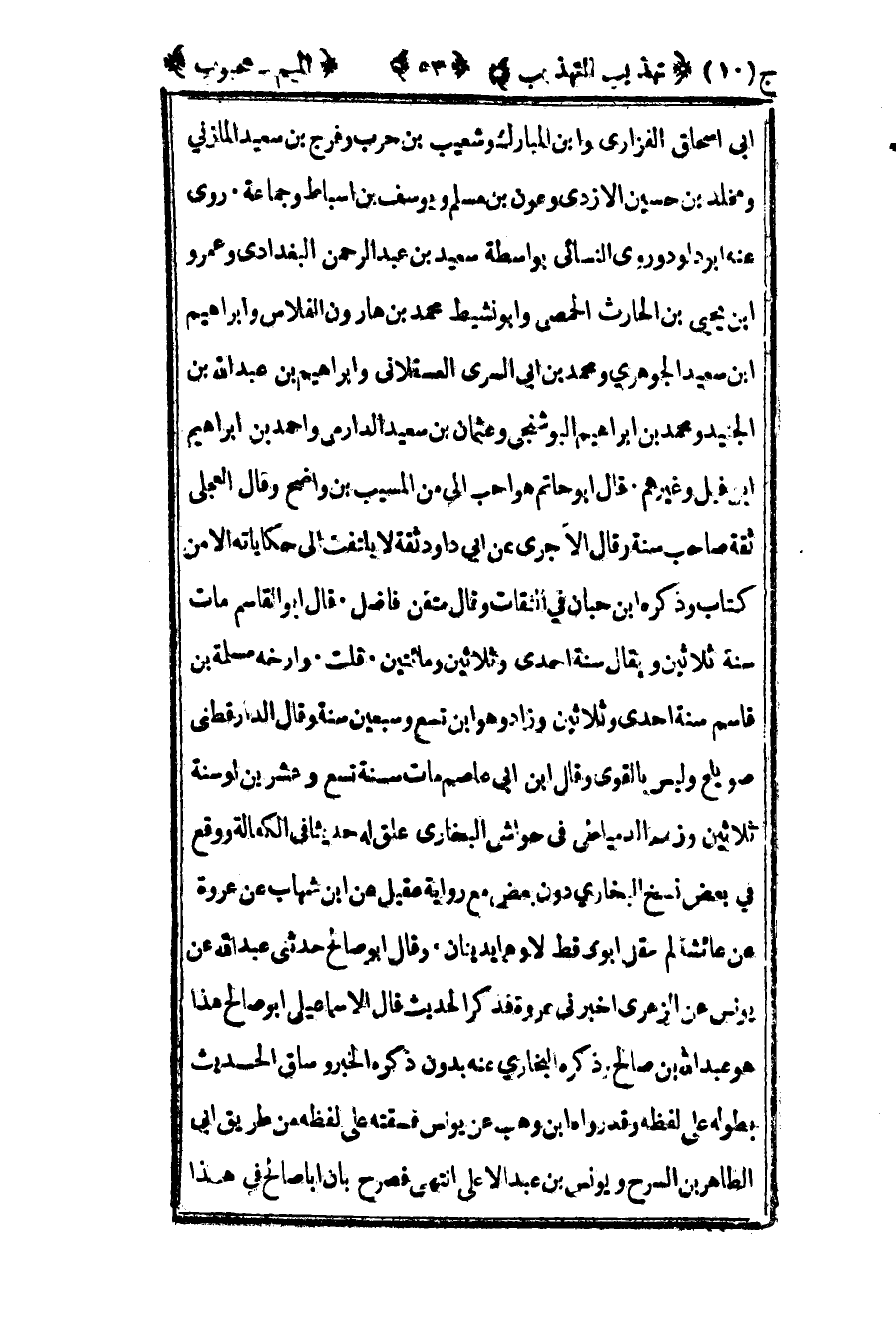 أبي إسحاق الفزاري وابن المبارك وشعيب بن حرب وفرج بن سعيد المازني ومخلد بن حسين الأزدي وعون بن مسلم ويوسف بن أسباط وجماعة روى عنه أبو داود وروى النسائي بواسطة سعيد بن عبد الرحمن البغدادي وعمرو بن يحيى بن الحارث الحمصي وأبو نشيط محمد بن هارون الفلاس وإبراهيم بن سعيد الجوهري ومحمد بن أبي السري العسقلاني وإبراهيم بن عبد الله بن الجنيد ومحمد بن إبراهيم البوشنجي وعثمان بن سعيد الدارمي وأحمد بن إبراهيم بن فيل وغيرهم قال أبو حاتم هو أحب إلي من المسيب بن واضح وقال العجلي ثقة صاحب سنة وقال الآجري عن أبي داود ثقة لا يلتفت إلى حكاياته إلا من كتاب وذكره بن حبان في الثقات وقال متقن فاضل وقال أبو القاسم مات سنة ثلاثين ويقال سنة إحدى وثلاثين ومائتين قلت وأرخه مسلمة بن قاسم سنة إحدى وثلاثين وزاد وهو بن تسع وسبعين سنة وقال الدارقطني صويلح وليس بالقوي وقال بن أبي عاصم مات سنة تسع وعشرين أو سنة ثلاثين وزعم الدمياطي في حواشي البخاري علق له حديثا في الكفالة ووقع في بعض نسخ البخاري دون بعض مع رواية عقيل عن بن شهاب عن عروة عن عائشة لم يقل أبوي قط لا وهما يدينان وقال أبو صالح حدثني عبد الله عن يونس عن الزهري أخبرني عروة فذكر الحديث قال الإسماعيلي أبو صالح هذا هو عبد الله بن صالح وذكره البخاري عنه بدون ذكره الخبر وساق الحديث بطوله على لفظه وقد رواه بن وهب عن يونس فسقته على لفظه من طريق أبي الطاهر بن السرح ويونس بن عبد الأعلى انتهى فصرح بأن أبا صالح في هذا