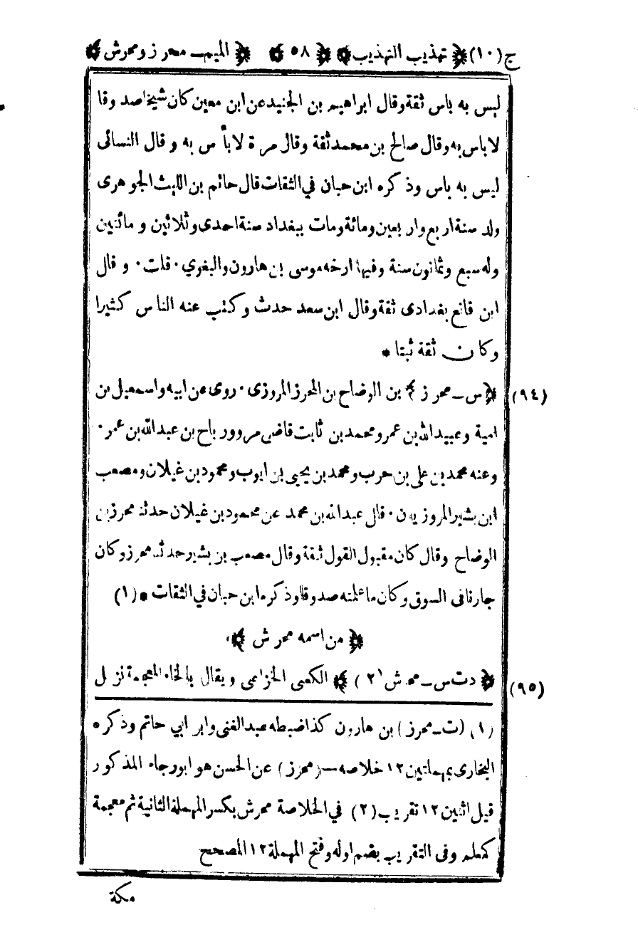 1 "ت- محرز" بن هارون كذا ضبطه عبد الغني وابن أبي حاتم وذكره البخاري بمهلتين 12 خلاصه – "محرز" عن الحسن هو أبو رجاء المذكور قيل اثنتين 12 تقريب.