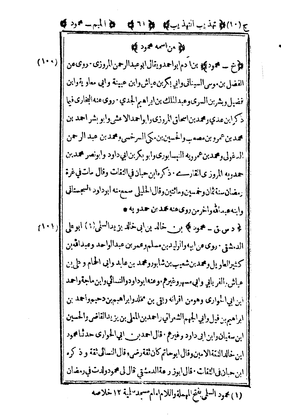 101 – "د س ق – محمود" بن خالد بن أبي خالد يزيد السلمي أبو علي الدمشقي روى عن أبيه والوليد بن مسلم وعمر بن عبد الواحد وعبد الله بن كثير الطويل ومحمد بن شعيب بن شابور ومحمد بن عابد وأبي الحمام وعلي بن عياش والفريابي وأبي مسهر وغيرهم وعنه أبو داود والنسائي وابن ماجة وأحمد بن أبي الحواري وهو من أقرانه وبقي بن مخلد وإبراهيم بن دحيم وأحمد بن إبراهيم بن فيل وأبي الجهم الشعراني وأحمد بن المعلى بن يزيد القاضي والحسين بن سفيان وابن أبي داود وغيرهم قال أحمد بن أبي الحواري حدثنا محمود بن خالد الثقة الأمين وقال أبو حاتم كان ثقة رضي وقال النسائي ثقة وذكره بن حبان في الثقات قال أبو زرعة الدمشقي قال لي محمود ولدت في رمضان