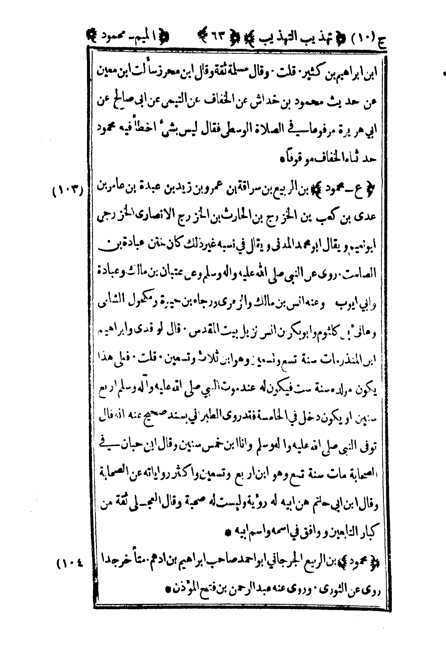 104- "محمود" بن الربيع الجرجاني أبو أحمد صاحب إبراهيم بن أدهم متأخر جدا روى عن الثوري وروى عنه عبد الرحمن بن فتح المؤذن.