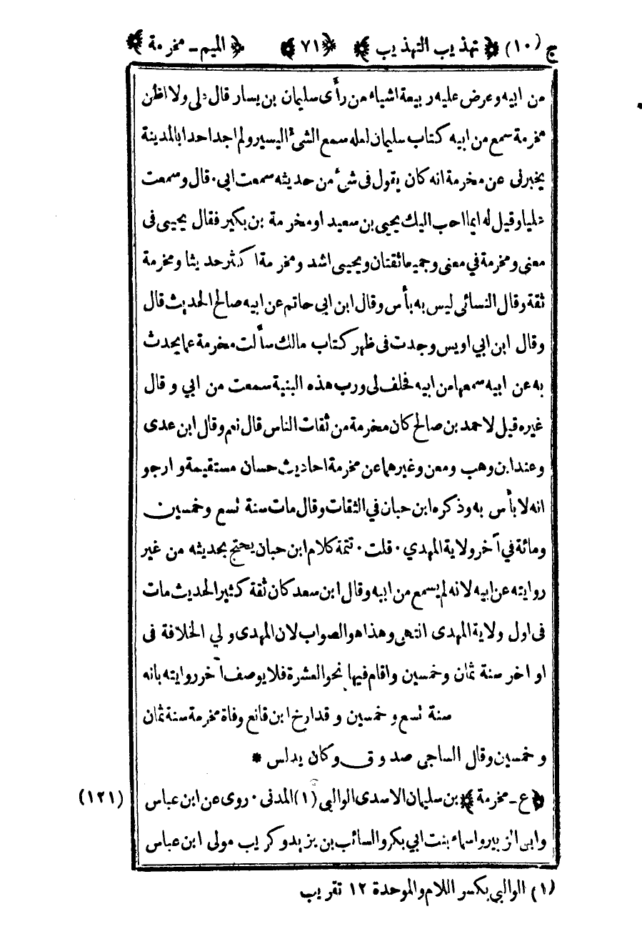 121 – "ع – مخرمة" بن سليمان الأسدي الوالبي1 المدني روى عن بن عباس وابن الزبير وأسماء بنت أبي بكر والسائب بن يزيد وكريب مولى ابن عباس