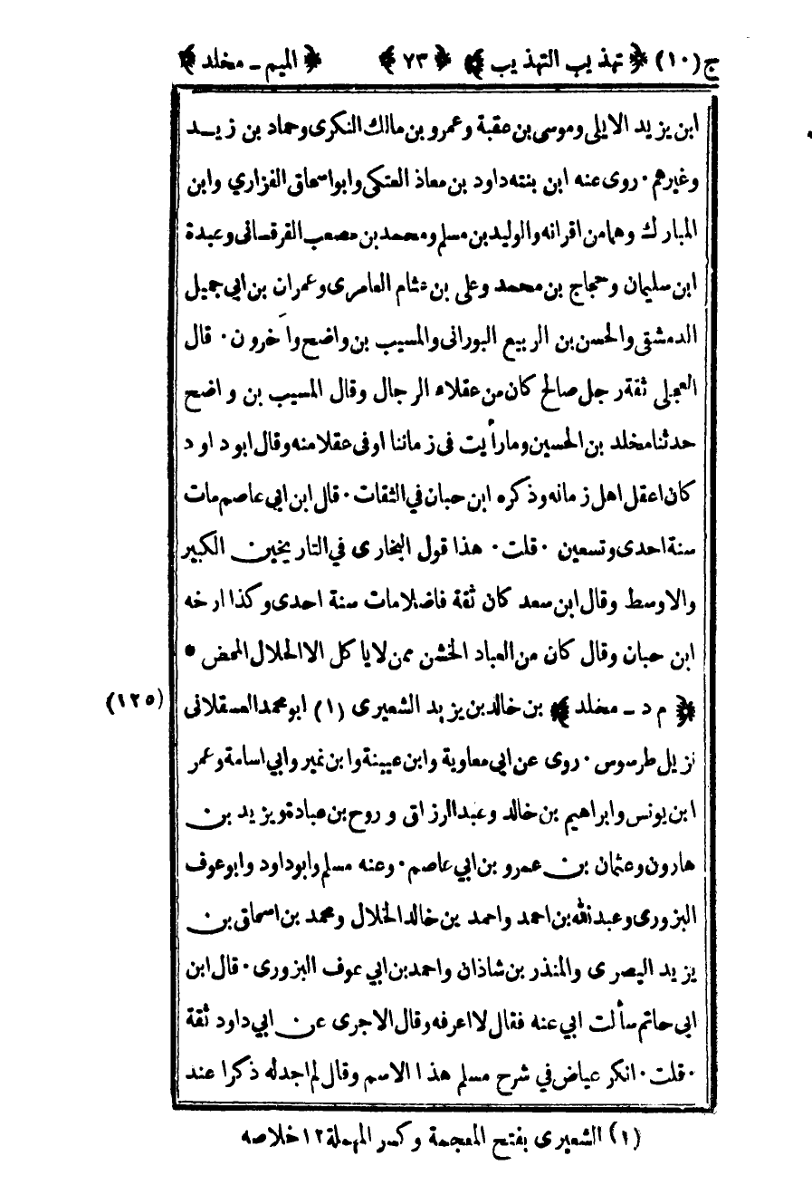 125 – "م د – مخلد" بن خالد بن يزيد الشعيري1 أبو محمد العسقلاني نزيل طرسوس روى عن أبي معاوية وابن عيينة وابن نمير وأبي أسامة وعمر بن يونس وإبراهيم بن خالد وعبد الرزاق وروح بن عبادة ويزيد بن هارون وعثمان بن عمرو بن أبي عاصم وعنه مسلم وأبو داود وأبو عوف البزوري وعبد الله بن أحمد وأحمد بن خالد الخلال ومحمد بن إسحاق بن يزيد البصري والمنذر بن شاذان وأحمد بن أبي عوف البزوري قال بن أبي حاتم سألت أبي عنه فقال لا أعرفه وقال الآجري عن أبي داود ثقة قلت أنكر عياض في شرح مسلم هذا الاسم وقال لم أجد له ذكرا عند