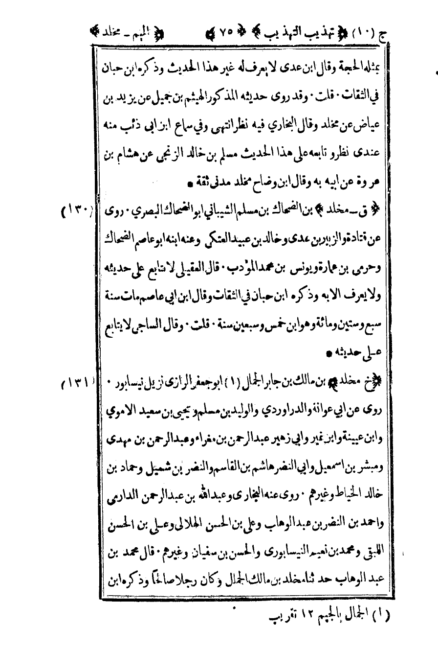 131 - "خ مخلد" بن مالك بن جابر الجمال1 أبو جعفر الرازي نزيل نيسابور روى عن أبي عوانة والداروردي والوليد بن مسلم ويحيى بن سعيد الأموي وابن عيينة وابن نمير وأبي زهير عبد الرحمن بن مغراء وعبد الرحمن بن مهدي ومبشر بن إسماعيل وأبي النضر هاشم بن القاسم والنضر بن شميل وحماد بن خالد الخياط وغيرهم روى عنه البخاري وعبد الله بن عبد الرحمن الدارمي وأحمد بن النضر بن عبد الوهاب وعلي بن الحسن الهلالي وعلي بن الحسن اللبقي ومحمد بن نعيم النيسابوري والحسن بن سفيان وغيرهم قال محمد بن عبد الوهاب حدثنا مخلد بن مالك الجمال وكان رجلا صالحا وذكره ابن