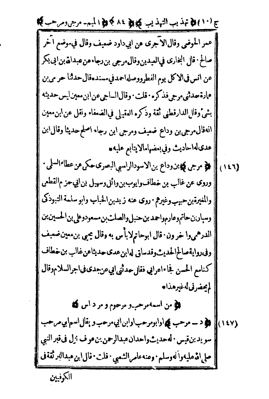 147- "د – مرحب" أو أبو مرحب أو بن أبي مرحب ويقال اسم أبي مرحب سويد بن قيس له حديث واحد أن عبد الرحمن بن عوف نزل في قبر النبي صلى الله عليه وسلم وعنه عامر الشعبي قلت قال بن عبد البر ثقة في