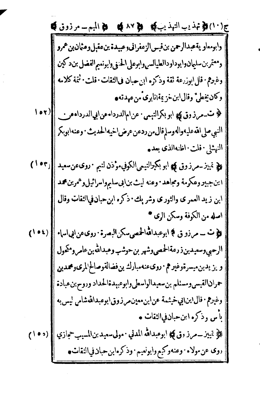 152- "ت – مرزوق" أبو بكر التيمي عن أم الدرداء عن أبي الدرداء عن النبي صلى الله عليه وسلم قال من رد عرض أخيه الحديث وعنه أبو بكر النهشلي قلت أظنه الذي بعده.