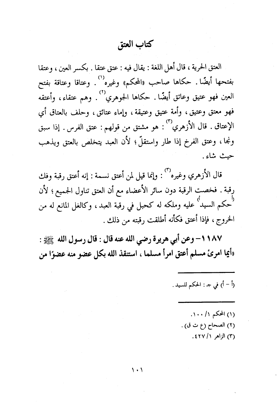 العتق الحرية، قال أهل اللغة: يقال فيه: عتق عتقا. بكسر العين، وعتقا بفتحها أيضًا. حكاها صاحب "المحكم" وغيره (¬1). وعتاقا وعتاقة بفتح العين فهو عتيق وعاتق أيضًا. حكاها الجوهري (¬2). وهم عتقاء، وأعتقه فهو معتق وعتيق، وأمة عتيق وعتيقة، وإماء عتائق، وحلف بالعتاق أي الإعتاق. قال الأزهري (¬3): هو مشتق من قولهم: عتق الفرس. إذا سبق ونجا، وعتق الفرخ إذا طار واستقلّ، لأن العبد يتخلص بالعتق ويذهب حيث شاء.