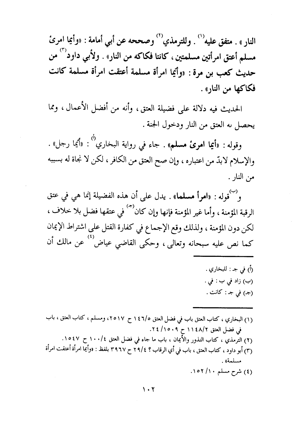 (¬1) البخاري، كتاب العتق باب في فضل العتق 5/ 146 ح 2517، ومسلم، كتاب العتق، باب في فضل العتق 2/ 1148 ح 1509/ 24.