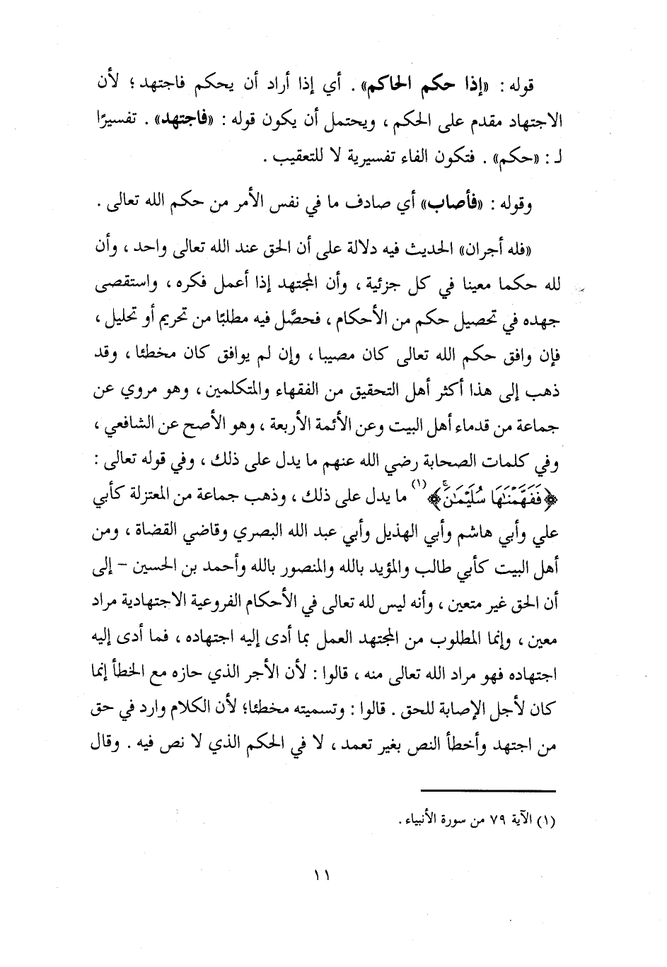 "فله أجران" الحديث فيه دلالة على أن الحق عند الله تعالى واحد، وأن لله حكما معينا في كل جزئية، وأن المجتهد إذا أعمل فكره، واستقصى جهده في تحصيل حكم من الأحكام، فحصَّل فيه مطلبًا من تحريم أو تحليل، فإن وافق حكم الله تعالى كان مصيبا، وإن لم يوافق كان مخطئا، وقد ذهب إلى هذا أكثر أهل التحقيق من الفقهاء والمتكلمين، وهو مروي عن جماعة من قدماء أهل البيت وعن الأئمة الأربعة، وهو الأصح عن الشافعي، وفي كلمات الصحابة رضي الله عنهم ما يدل على ذلك، وفي قوله تعالى: {فَفَهَّمْنَاهَا سُلَيْمَانَ} (¬1) ما يدل على ذلك، وذهب جماعة من المعتزلة كأبي علي وأبي هاشم وأبي الهذيل وأبي عبد الله البصري وقاضي القضاة، ومن أهل البيت كأبي طالب والمؤيد بالله والمنصور بالله وأحمد بن الحسين -إلى أن الحق غير متعين، وأنه ليس لله تعالى في الأحكام الفروعية الاجتهادية مراد معين، وإنما المطلوب من المجتهد العمل بما أدى إليه اجتهاده، فما أدى إليه اجتهاده فهو مراد الله تعالى منه، قالوا: لأن الأجر الذي حازه مع الخطأ إنما كان لأجل الإصابة للحق. قالوا: وتسميته مخطئا؛ لأن الكلام وارد في حق من اجتهد وأخطأ النص بغير تعمد، لا في الحكم الذي لا نص فيه. وقال