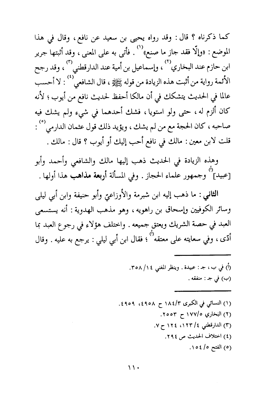 وهذه الزيادة في الحديث ذهب إليها مالك والشافعي وأحمد وأبو [عبيد] (أ) وجمهور علماء الحجاز. وفي المسألة أربعة مذاهب هذا أولها.