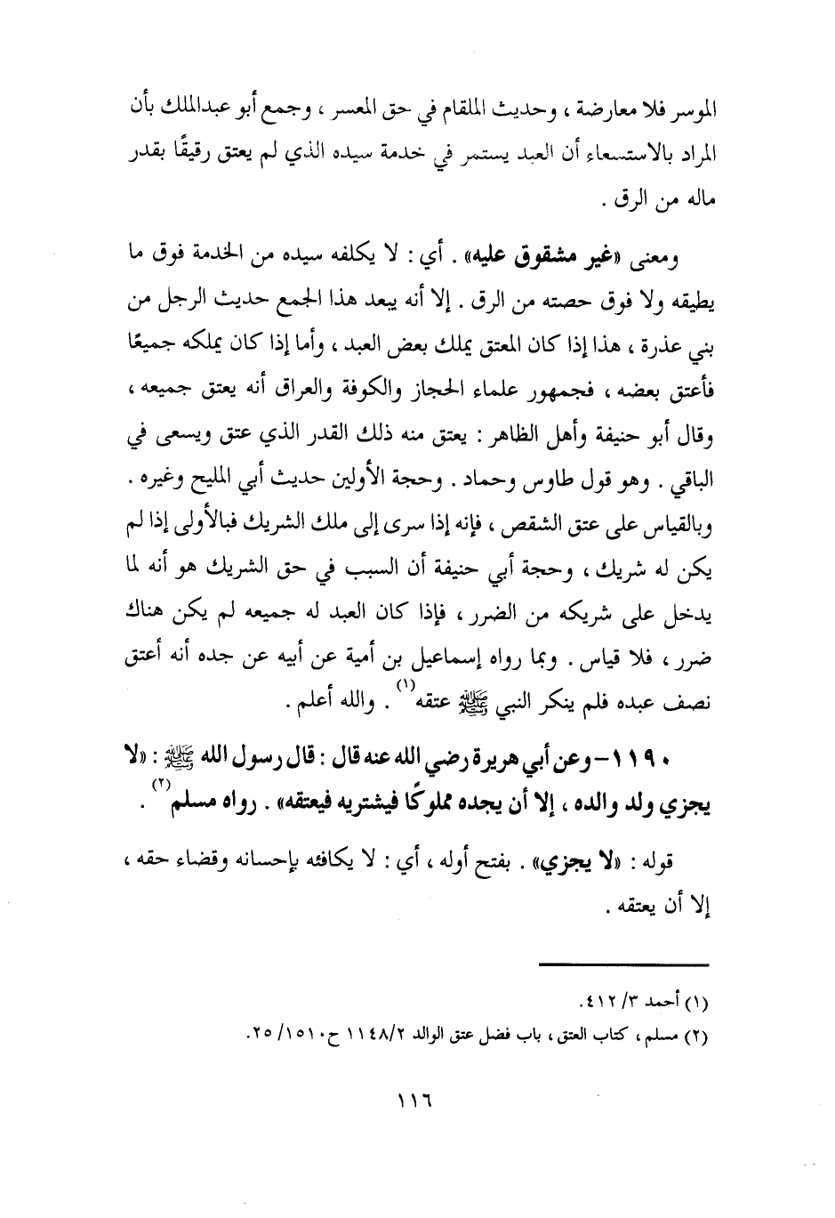 1190 - وعن أبي هريرة رضي الله عنه قال: قال رسول الله - صلى الله عليه وسلم -: "لا يجزي ولد والده، إلا أن يجده مملوكًا فيشتريه فيعتقه". رواه مسلم (¬2).