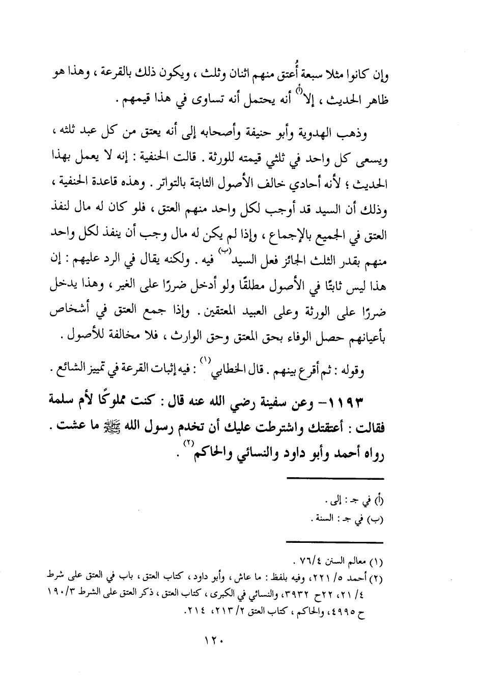 1193 - وعن سفينة رضي الله عنه قال: كنت مملوكًا لأم سلمة فقالت: أعتقتك واشترطت عليك أن تخدم رسول الله - صلى الله عليه وسلم - ما عشت. رواه أحمد وأبو داود والنسائي والحاكم (¬2).