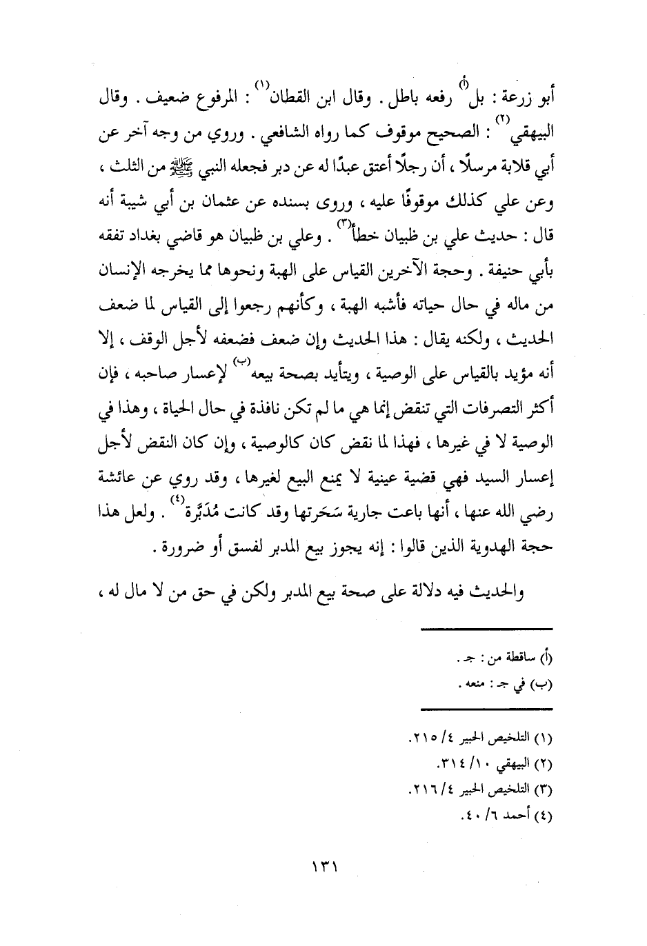 أبو زرعة: بل (أ) رفعه باطل. وقال ابن القطان (¬1): المرفوع ضعيف. وقال البيهقي (¬2): الصحيح موقوف كما رواه الشافعي. وروي من وجه آخر عن أبي قلابة مرسلًا، أن رجلًا أعتق عبدًا له عن دبر فجعله النبي - صلى الله عليه وسلم - من الثلث، وعن علي كذلك موقوفًا عليه، وروى بسنده عن عثمان بن أبي شيبة أنه قال: حديث علي بن ظبيان خطأ (¬3). وعلي بن ظبيان هو قاضي بغداد تفقه بأبي حنيفة. وحجة الآخرين القياس على الهبة ونحوها مما يخرجه الإنسان من ماله في حال حياته فأشبه الهبة، وكأنهم رجعوا إلى القياس لما ضعف الحديث، ولكنه يقال: هذا الحديث وإن ضعف فضعفه لأجل الوقف، إلا أنه مؤيد بالقياس على الوصية، ويتأيد بصحة بيعه (ب) لإعسار صاحبه، فإن أكثر التصرفات التي تنقض إنما هي ما لم تكن نافذة في حال الحياة، وهذا في الوصية لا في غيرها، فهذا لما نقض كان كالوصية، وإن كان النقض لأجل إعسار السيد فهي قضية عينية لا يمنع البيع لغيرها، وقد روي عن عائشة رضي الله عنها، أنها باعت جارية سَحَرتها وقد كانت مُدَبَّرة (¬4). ولعل هذا حجة الهدوية الذين قالوا: إنه يجوز بيع المدبر لفسق أو ضرورة.