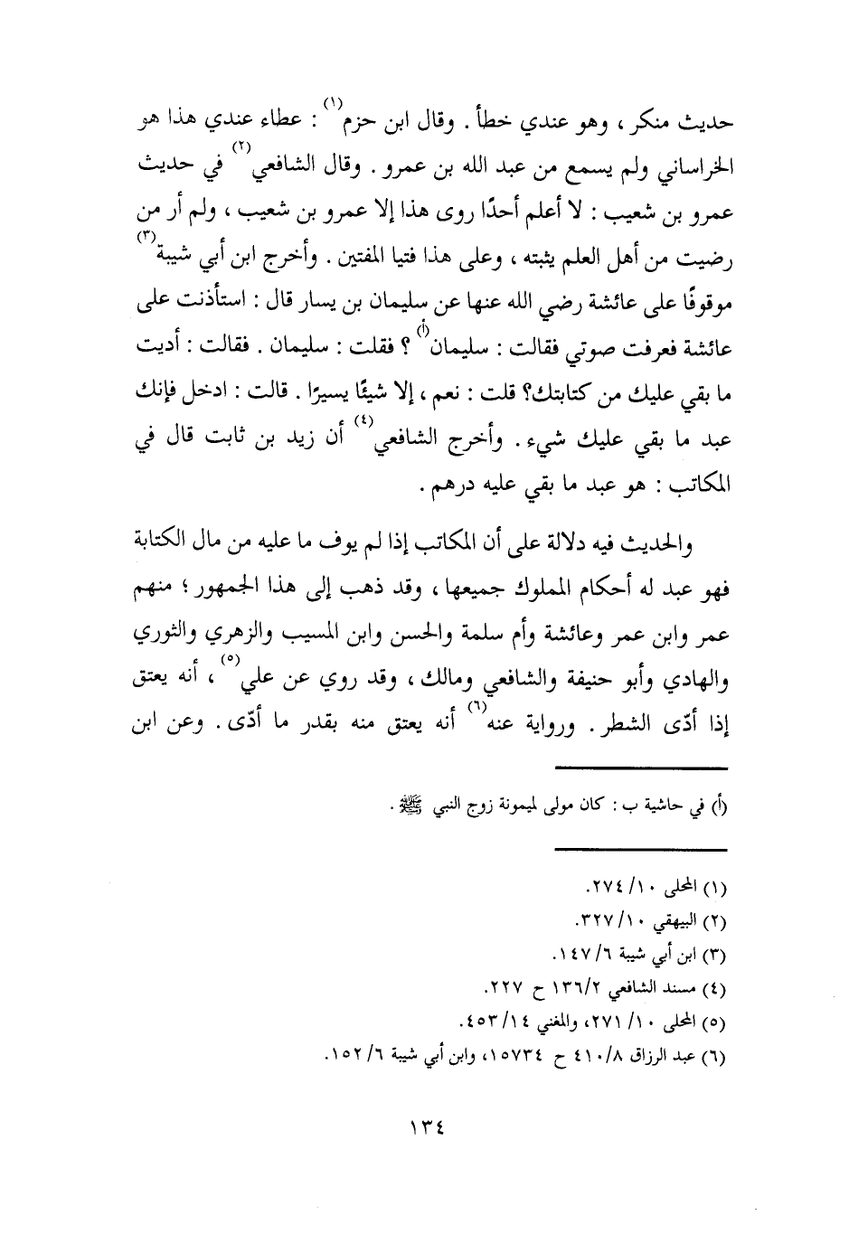 حديث منكر، وهو عندي خطأ. وقال ابن حزم (¬1): عطاء عندي هذا هو الخراساني ولم يسمع من عبد الله بن عمرو. وقال الشافعي (¬2) في حديث عمرو بن شعيب: لا أعلم أحدًا روى هذا إلا عمرو بن شعيب، ولم أر من رضيت من أهل العلم يثبته، وعلى هذا فتيا المفتين. واخرج ابن أبي شيبة (¬3) موقوفًا على عائشة رضي الله عنها عن سليمان بن يسار قال: استأذنت على عائشة فعرفت صوتي فقالت: سليمان (أ)؟ فقلت: سليمان. فقالت: أديت ما بقي عليك من كتابتك؟ قلت: نعم، إلا شيئًا يسيرًا. قالت: ادخل فإنك عبد ما بقي عليك شيء. وأخرج الشافعي (¬4) أن زيد بن ثابت قال في المكاتب: هو عبد ما بقي عليه درهم.