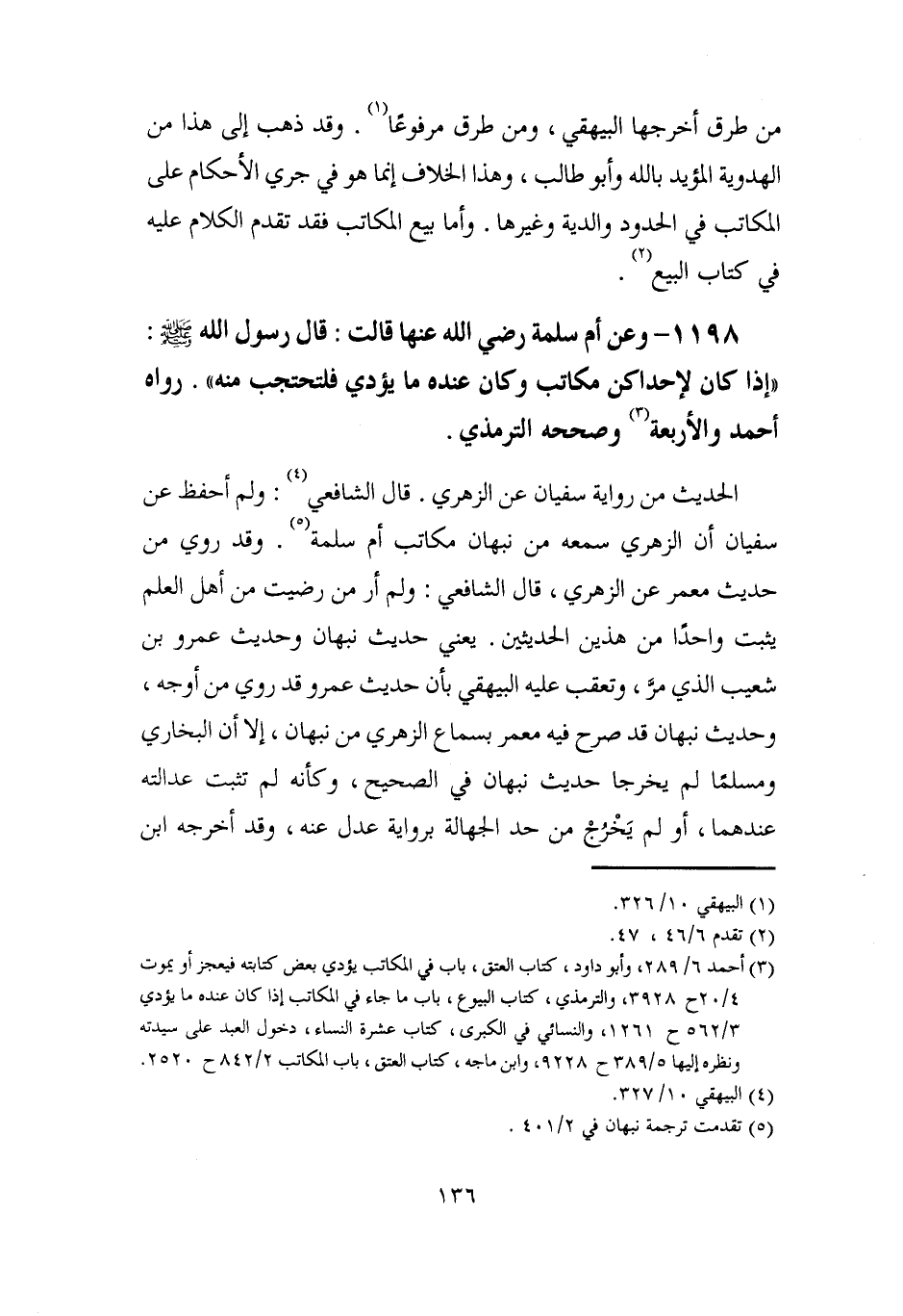 1198 - وعن أم سلمة رضي الله عنها قالت: قال رسول الله - صلى الله عليه وسلم -: "إذا كان لإحداكن مكاتب وكان عنده ما يؤدي فلتحتجب منه". رواه أحمد والأربعة (¬3) وصححه الترمذي.