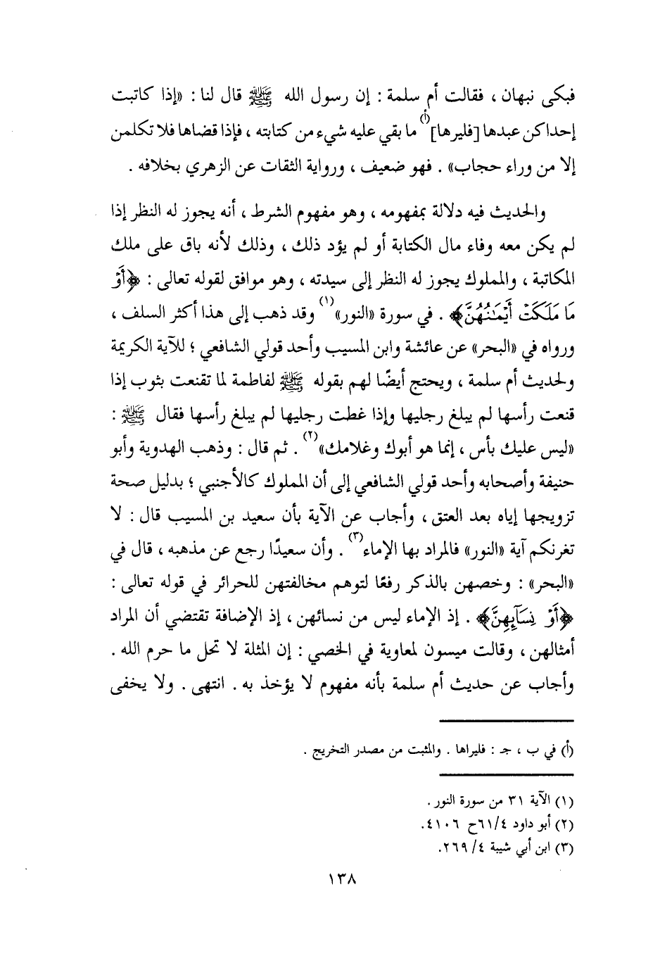 فبكى نبهان، فقالت أم سلمة: إن رسول الله - صلى الله عليه وسلم - قال لنا: "إذا كاتبت إحداكن عبدها [فليرها] (أ) ما بقي عليه شيء من كتابته، فإذا قضاها فلا تكلمن إلا من وراء حجاب". فهو ضعيف، ورواية الثقات عن الزهريّ بخلافه.