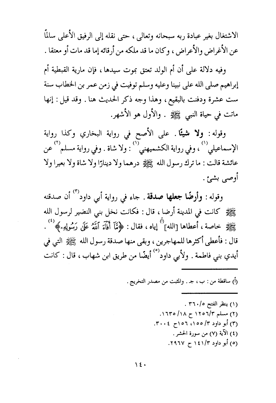 وقوله: وأرضًا جعلها صدقة. جاء في رواية أبي داود (¬3) أن صدقته - صلى الله عليه وسلم - كانت في المدينة أرضا، قال: فكانت نخل بني النضير لرسول الله - صلى الله عليه وسلم - خاصة، أعطاها [الله] (أ) إياه، فقال: {مَا أَفَاءَ اللَّهُ عَلَى رَسُولِهِ} (¬4). قال: فأعطى أكثرها للمهاجرين، وبقى منها صدقة رسول الله - صلى الله عليه وسلم - التي في أيدي بني فاطمة. ولأبي داود (¬5) أيضًا من طريق ابن شهاب، قال: كانت