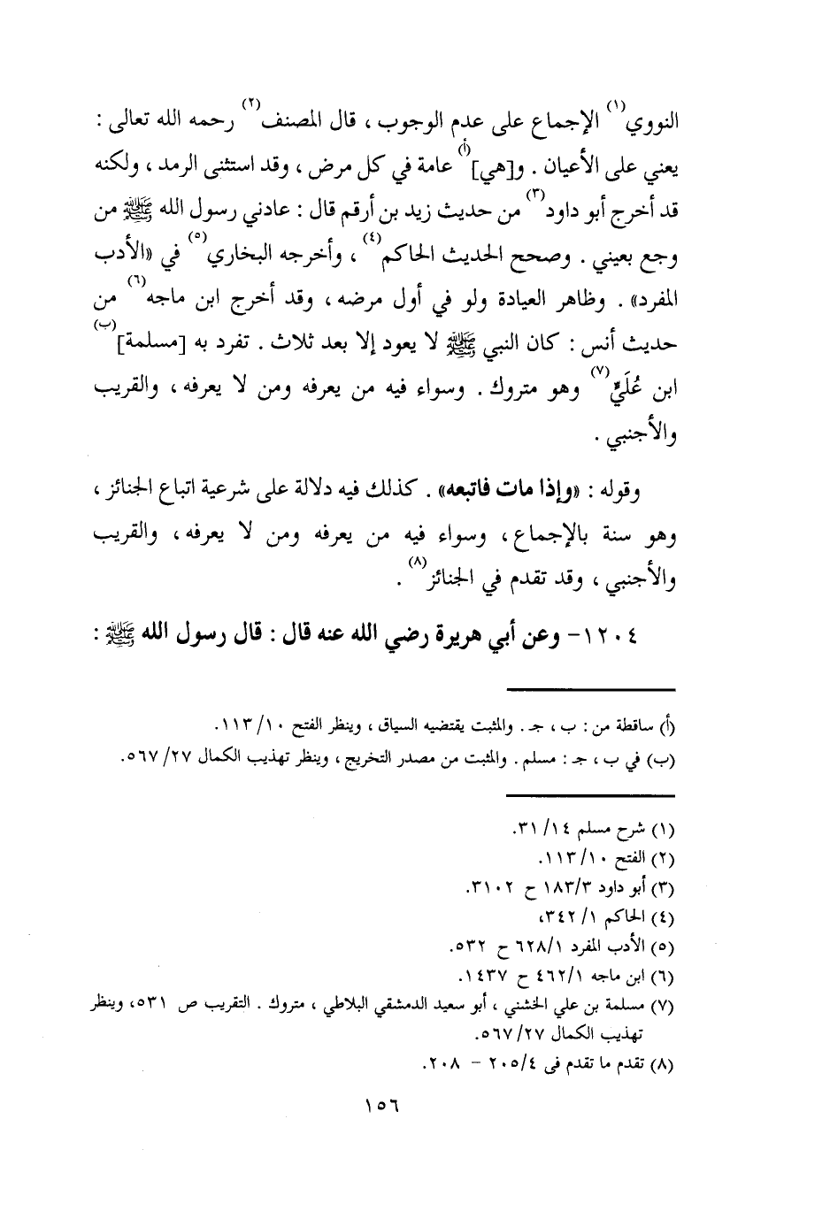 النووي (¬1) الإجماع على عدم الوجوب، قال المصنف (¬2) رحمه الله تعالى: يعني على الأعيان. و [هي] (أ) عامة في كل مرض، وقد استثنى الرمد، ولكنه قد أخرج أبو داود (¬3) من حديث زيد بن أرقم قال: عادني رسول الله - صلى الله عليه وسلم - من وجع بعيني. وصحح الحديث الحاكم (¬4)، وأخرجه البخاري (¬5) في "الأدب المفرد". وظاهر العيادة ولو في أول مرضه، وقد أخرج ابن ماجه (¬6) من حديث أنس: كان النبي - صلى الله عليه وسلم - لا يعود إلا بعد ثلاث. تفرد به [مسلمة] (ب) ابن عُلَيٍّ (¬7) وهو متروك. وسواء فيه من يعرفه ومن لا يعرفه، والقريب والأجنبي.