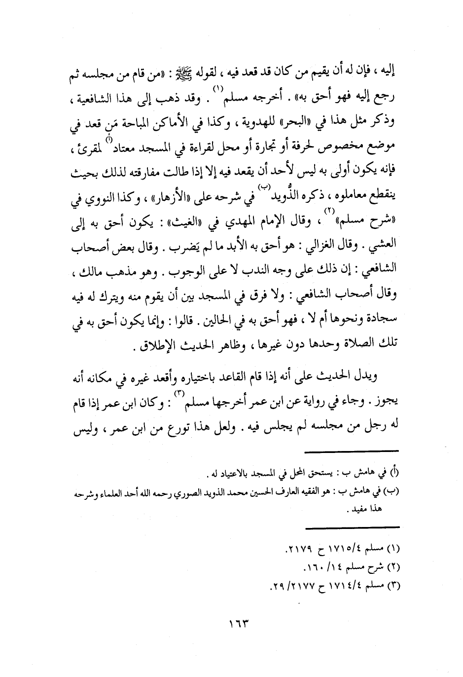 إليه، فإن له أن يقيم من كان قد قعد فيه، لقوله - صلى الله عليه وسلم -: "من قام من مجلسه ثم رجع إليه فهو أحق به". أخرجه مسلم (¬1). وقد ذهب إلى هذا الشافعية، وذكر مثل هذا في "البحر" للهدوية، وكذا في الأماكن المباحة مَن قعد في موضع مخصوص لحرفة أو تجارة أو محل لقراءة في المسجد معتاد (أ) لمقرئ، فإنه يكون أولى به ليس لأحد أن يقعد فيه إلا إذا طالت مفارقته لذلك بحيث ينقطع معاملوه، ذكره الذُّويد (ب) في شرحه على "الأزهار"، وكذا النووي في "شرح مسلم" (¬2)، وقال الإمام المهدي في "الغيث": يكون أحق به إلى العشي. وقال الغزالي: هو أحق به الأبد ما لم يَضرب. وقال بعض أصحاب الشافعي: إن ذلك على وجه الندب لا على الوجوب. وهو مذهب مالك، وقال أصحاب الشافعي: ولا فرق في المسجد بين أن يقوم منه ويترك له فيه سجادة ونحوها أم لا، فهو أحق به في الحالين. قالوا: وإنما يكون أحق به في تلك الصلاة وحدها دون غيرها، وظاهر الحديث الإطلاق.